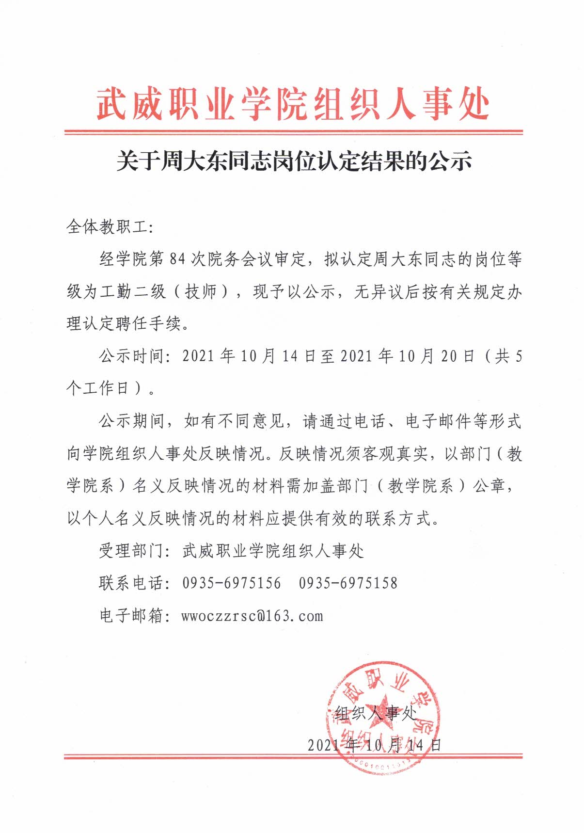關(guān)于周大東同志崗位認(rèn)定結(jié)果的公示