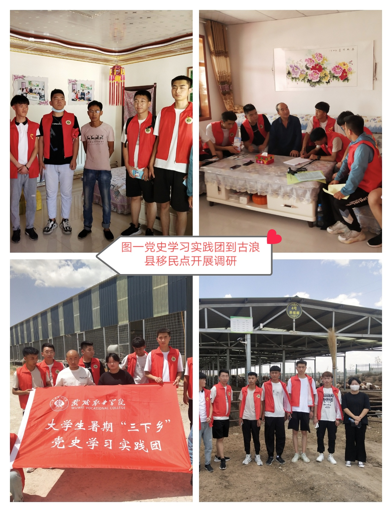 同學(xué)們來到了古浪縣黃花灘移民點,在富民新村全國脫貧攻堅先進個人-富民新村黨支部書記張延堂給同學(xué)們進行了講解,古浪縣支持貧困群眾自種自養(yǎng)發(fā)展產(chǎn)業(yè),打造移民區(qū)萬畝戈壁農(nóng)業(yè)、萬只種羊繁育、萬頭肉牛養(yǎng)殖、萬畝枸杞種植等高標準示范基地,全縣建成日光溫室1.4萬座2.8萬畝、養(yǎng)殖暖棚17.99萬座1079.4萬平方米,設(shè)施果蔬年產(chǎn)量達到6.5萬噸以上,牛、羊、雞、鴿存欄量分別達到6.95萬頭、202萬只、226萬只、9.1萬羽。來到李應(yīng)川家,新房子里溫煦如春。屋里依舊如2019年8月總書記來時來時那樣干凈整潔,唯一不同的是醒目地擺了一幅習(xí)近平總書記的剪紙畫像。李應(yīng)川兒子給同學(xué)們講:“現(xiàn)在我家的養(yǎng)殖、種植都搞起來了,盼望著總書記還能來我家看看,嘗嘗我們自己家里產(chǎn)的新鮮羊肉?。ㄈ鐖D一)