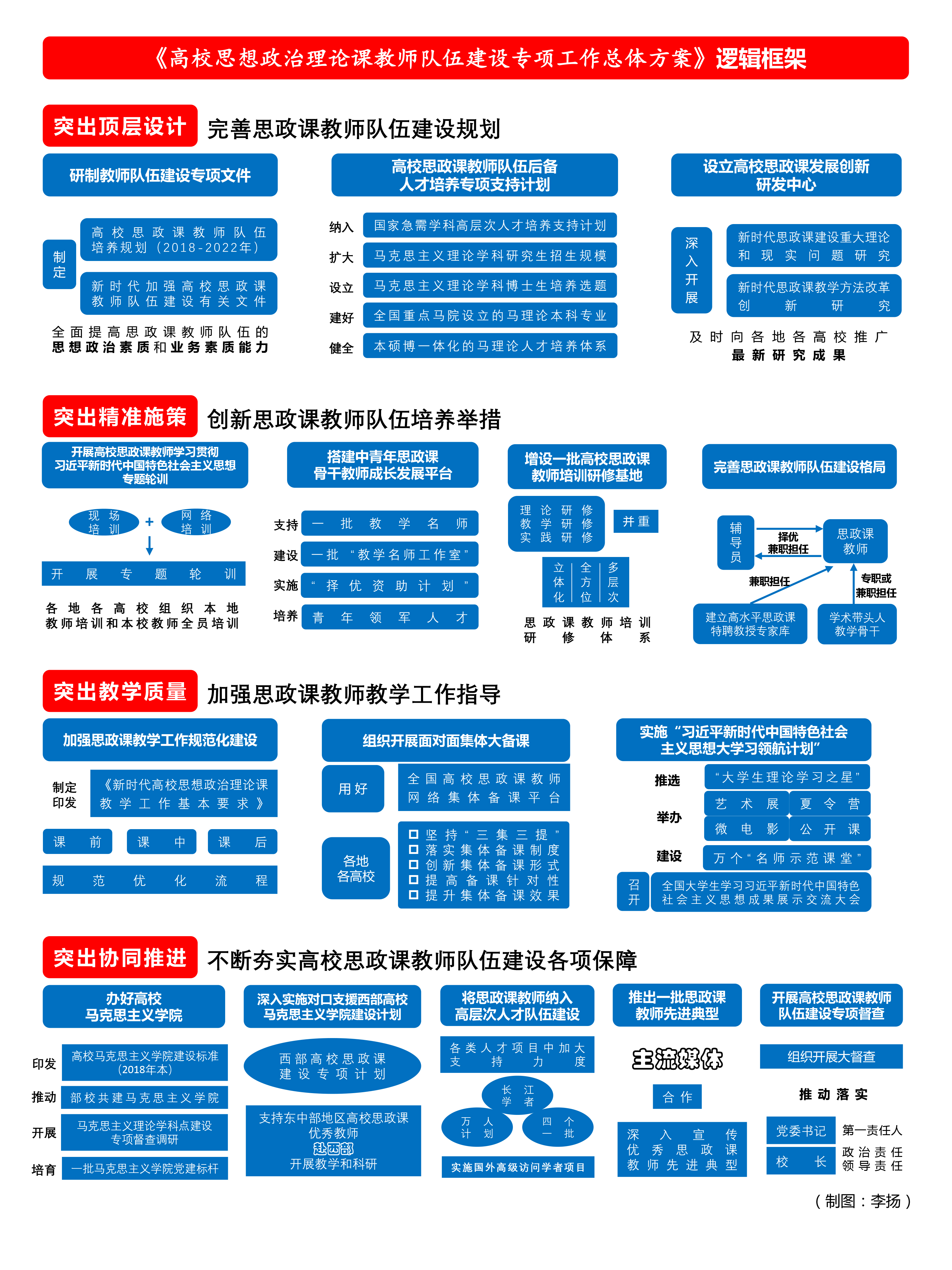 為全面推動習(xí)近平新時代中國特色社會主義思想進(jìn)教材進(jìn)課堂進(jìn)學(xué)生頭腦,聚焦提升思政課教師綜合素質(zhì)和專業(yè)化水平,繼續(xù)打好提高高校思政課質(zhì)量和水平的攻堅戰(zhàn),培養(yǎng)擔(dān)當(dāng)民族復(fù)興大任的時代新人,教育部決定2018年實(shí)施高校思想政治理論課教師隊伍建設(shè)專項工作,并于日前印發(fā)了工作總體方案。