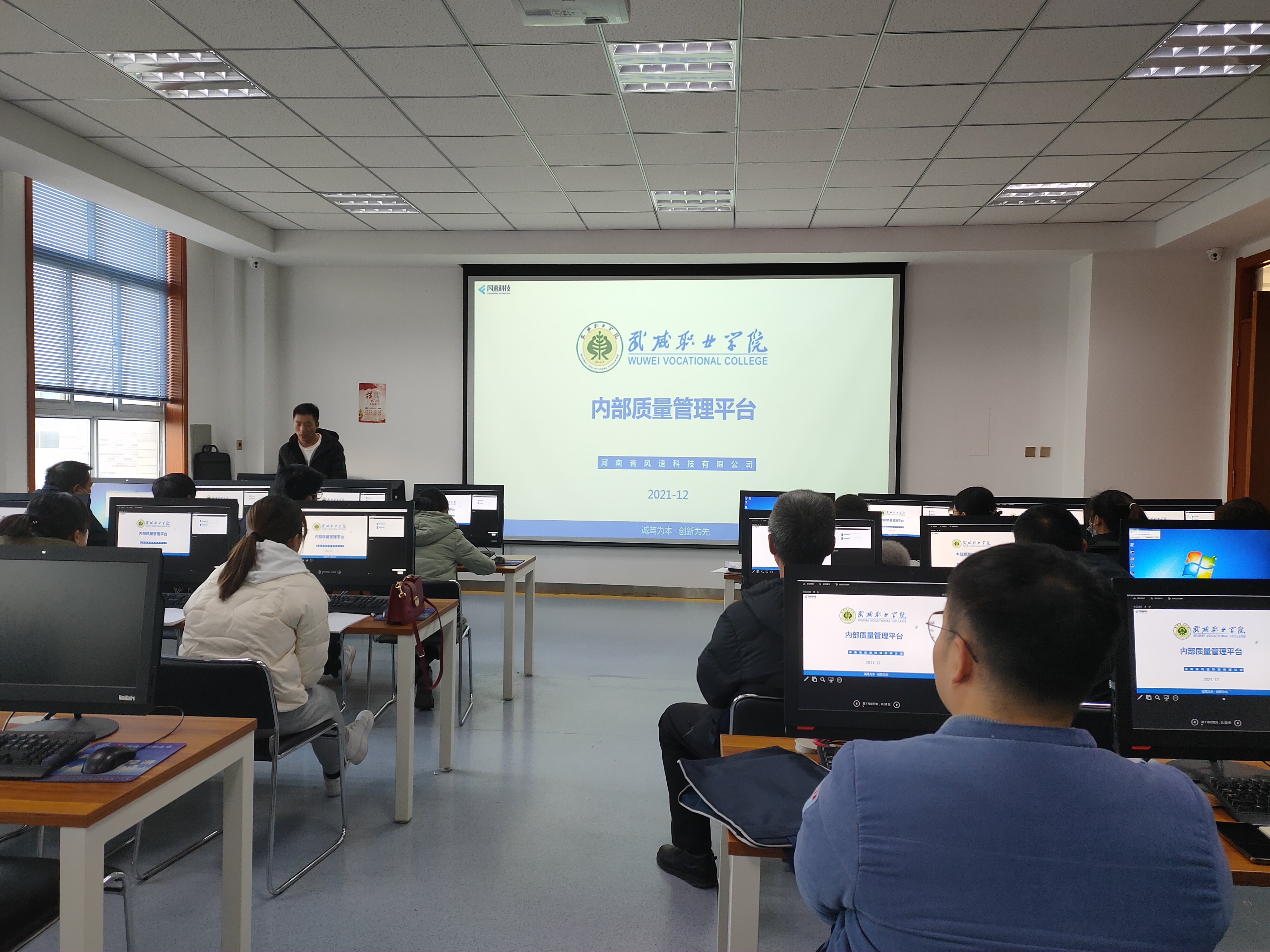 風(fēng)速科技有限公司項目經(jīng)理徐來彬?qū)處熯M(jìn)行了培訓(xùn)。重點介紹了內(nèi)部質(zhì)量管理平臺整體架構(gòu)、主要功能、任務(wù)提取、上傳、轉(zhuǎn)辦,任務(wù)辦理與審核、通報、文檔庫上傳與使用、績效考核等,并進(jìn)行現(xiàn)場操作演示,就參會教師存在的問題進(jìn)行了溝通交流。