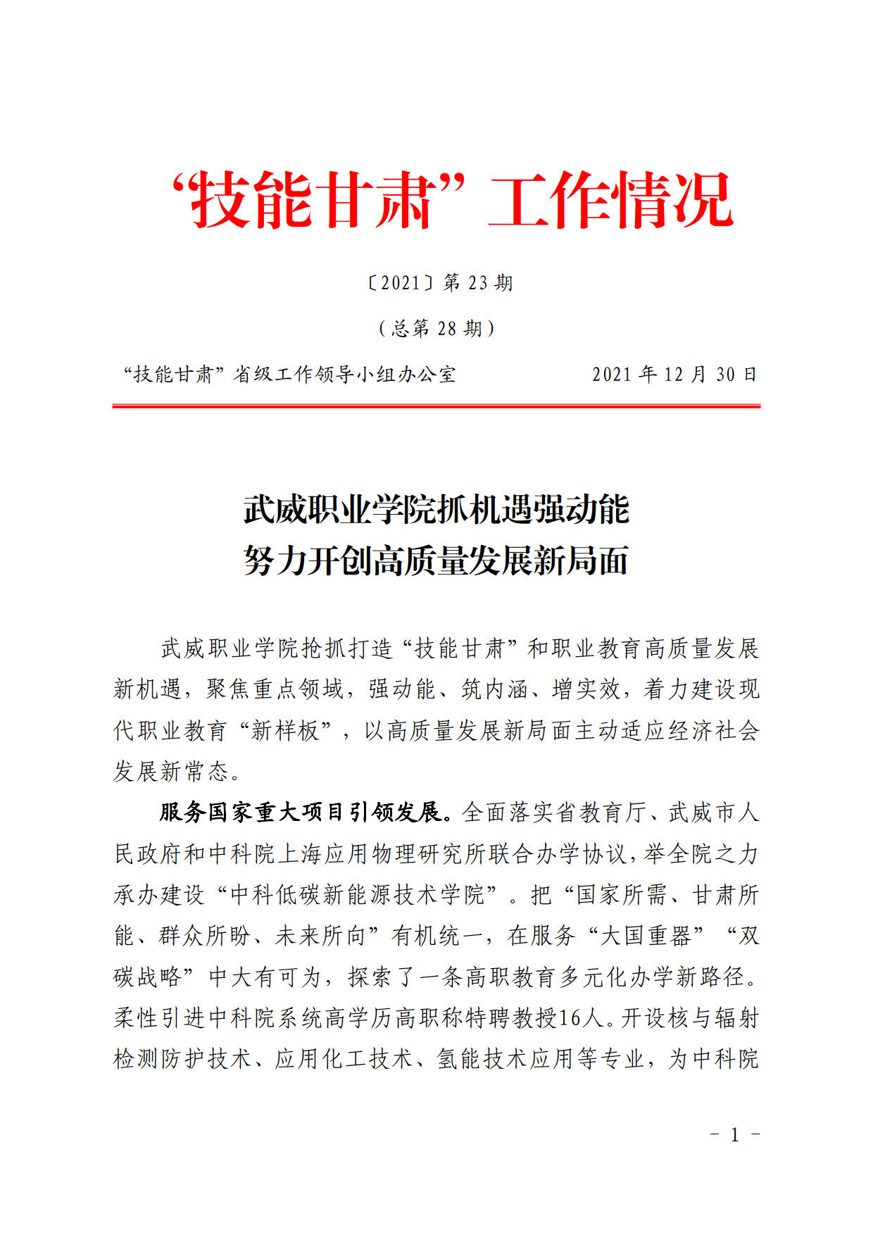 技能甘肅工作情況第28期:武威職業(yè)學(xué)院抓機(jī)遇強(qiáng)動(dòng)能努力實(shí)現(xiàn)高質(zhì)量發(fā)展