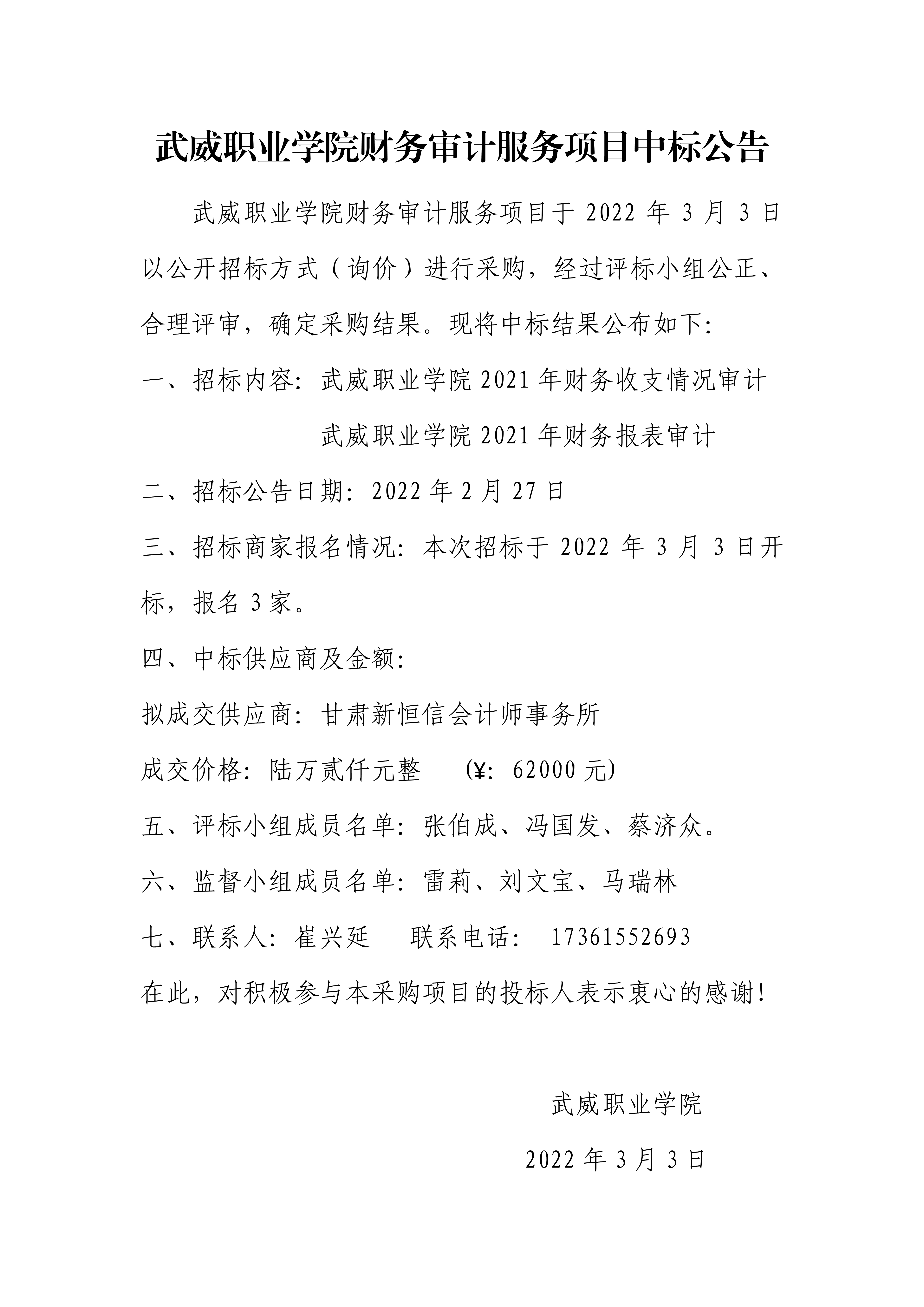 武威職業(yè)學(xué)院財務(wù)審計服務(wù)項目中標(biāo)公告