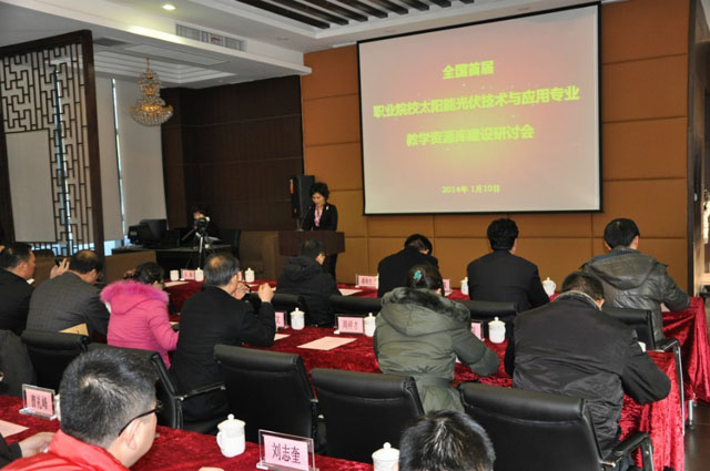 在研討會上,來自職業(yè)院校領導及光伏專業(yè)的專家教授分別對專業(yè)教學資源庫的建設提出了各自的意見及建議。中國職教學會校企合作工作委員會主任潘海生發(fā)表了重要講話。職教聯盟秘書長陳建民就聯盟2013年度工作進行了總結,并對2014年度工作進行了規(guī)劃。無錫科技職業(yè)學院的曹建林教授就專業(yè)建設服務區(qū)域經濟進行了深入淺出的分析。蘇州職業(yè)大學的曹豐文教授提出了對于教學資源庫建設目標與思路的意見與看法。無錫尚德公司副總裁朱景兵博士與在座的與會人士交流了怎樣對接企業(yè)培養(yǎng)技能人才的經驗。