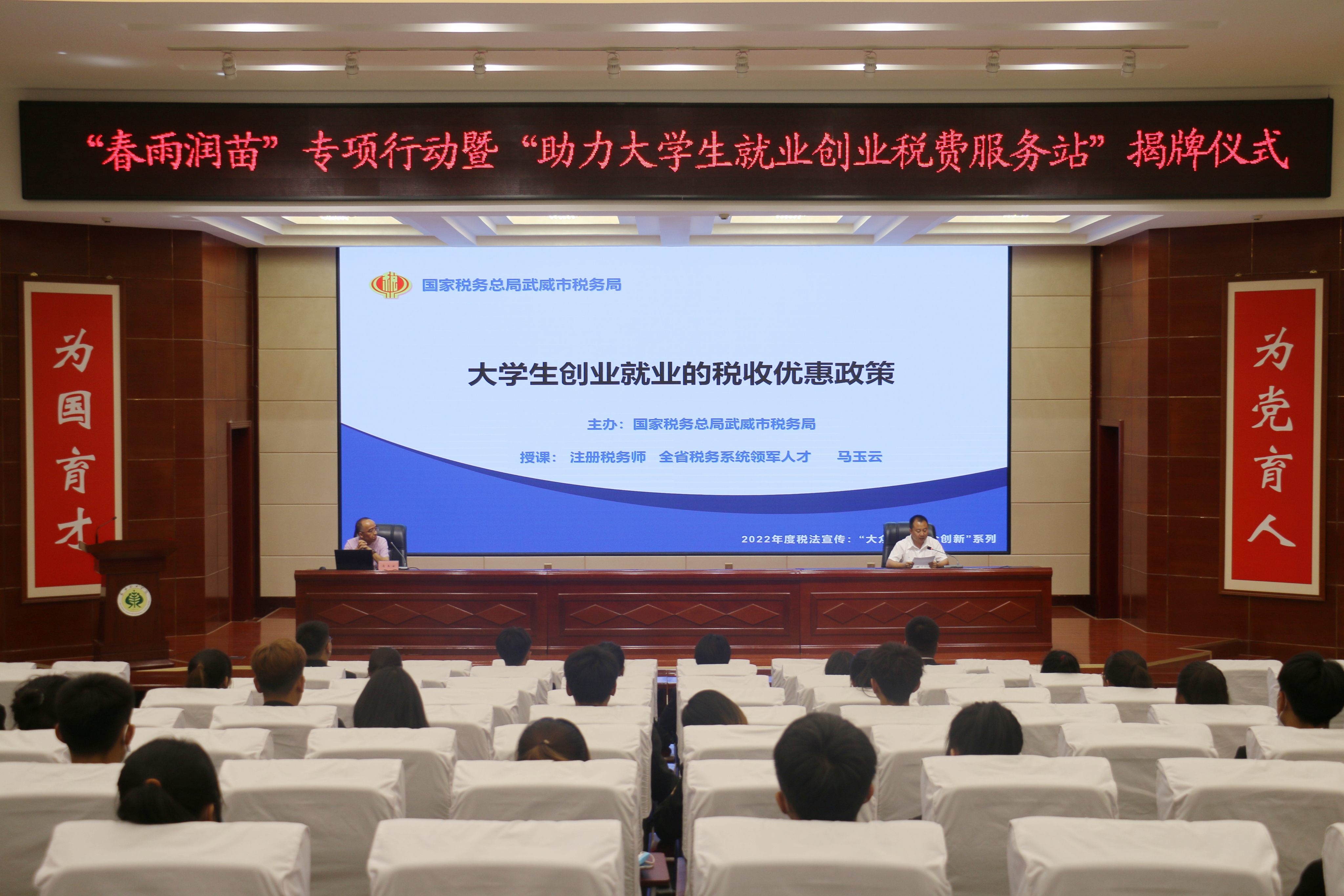 揭牌儀式結(jié)束后,武威市稅費(fèi)專家顧問(wèn)團(tuán)隊(duì)代表馬玉云為學(xué)校師生帶來(lái)“就業(yè)創(chuàng)業(yè)稅費(fèi)第一課”的報(bào)告,向大學(xué)生們普及稅法知識(shí),特別針對(duì)高校畢業(yè)生就業(yè)創(chuàng)業(yè)稅費(fèi)優(yōu)惠政策、組合式稅費(fèi)支持政策、個(gè)人所得稅政策以及社保繳納等內(nèi)容進(jìn)行了詳細(xì)解讀,為大學(xué)生創(chuàng)業(yè)就業(yè)新苗送上一場(chǎng)“及時(shí)雨”。