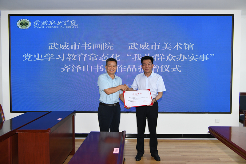黨委書(shū)記、校長(zhǎng)趙明向市書(shū)畫(huà)院(美術(shù)館)院長(zhǎng)齊澤山頒發(fā)了捐贈(zèng)證書(shū),武威市書(shū)畫(huà)院(武威美術(shù)館)院長(zhǎng)齊澤山將精心創(chuàng)作了8幅大幅書(shū)法作品捐贈(zèng)給學(xué)校。