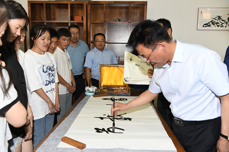 捐贈(zèng)儀式前,齊澤山一行參觀了學(xué)校紅色文化藝術(shù)館、學(xué)生發(fā)展中心、雙創(chuàng)中心、藝術(shù)與教育學(xué)院書(shū)法實(shí)訓(xùn)室等場(chǎng)地,并現(xiàn)場(chǎng)指導(dǎo)學(xué)校志通書(shū)法協(xié)會(huì)學(xué)生習(xí)作。