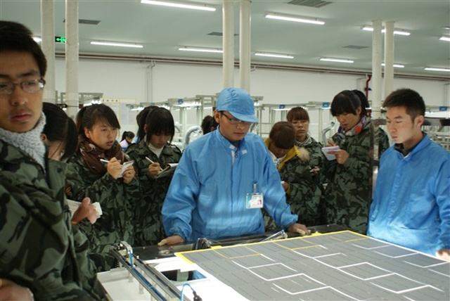 在校外實(shí)訓(xùn)過程中,由工藝部楊經(jīng)理和工藝部文工程師給大家介紹公司情況、公司管理規(guī)范,并帶領(lǐng)大家進(jìn)行參觀,給學(xué)生詳細(xì)講解整個(gè)光伏產(chǎn)業(yè)鏈,包括硅片的生產(chǎn)、電池片的生產(chǎn)和太陽(yáng)能電池組件的生產(chǎn),重點(diǎn)是光伏組件的生產(chǎn)。實(shí)訓(xùn)期間由工廠師傅帶領(lǐng)學(xué)生在車間分組進(jìn)行實(shí)訓(xùn)。依據(jù)光伏組件生產(chǎn)工作流程實(shí)訓(xùn)內(nèi)容分為前道工序和后道工序,前道工序包括:電池片篩選、單焊、串焊、疊層、初檢、EL1測(cè)試和層壓;后道工序包括:削邊、裝邊框、裝接線盒、清洗、EL2測(cè)試、功率測(cè)試、終檢和包裝入庫(kù)。同學(xué)們通過親身體驗(yàn)和輪崗學(xué)習(xí),熟悉了光伏組件的每一道生產(chǎn)工序,對(duì)光伏組件的整個(gè)生產(chǎn)過程有了一個(gè)更加清晰的認(rèn)識(shí)和了解。