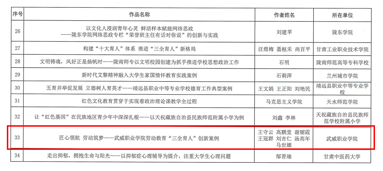 近日,2022年全省學(xué)校思想政治教育工作成果征集活動評選結(jié)果公布,武威職業(yè)學(xué)院喜獲佳績,兩件作品獲獎。其中,王守云、高鵬堂、謝麗霞、王冠群、劉吉仁、湯高年、馬世雄老師的《匠心領(lǐng)航 勞動筑夢—武威職業(yè)學(xué)院勞動教育“三全育人”創(chuàng)新案例》獲思想政治典型案例三等獎;張保海、馮文娟、謝麗霞老師的《基于“診改”的思政教育質(zhì)量評價(jià)體系構(gòu)建研究》獲思想政治論文三等獎。