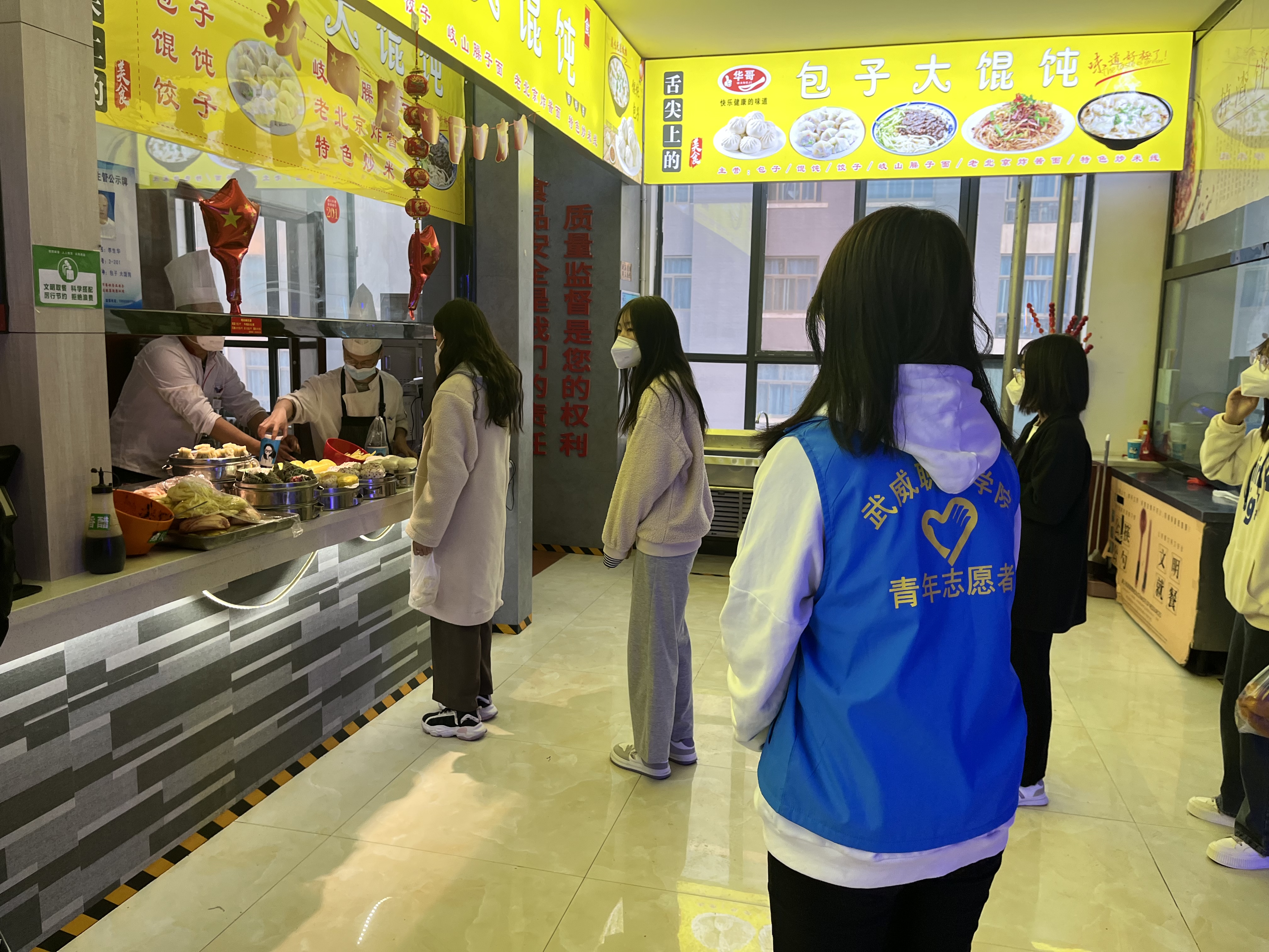 從學(xué)校實(shí)行最小單元宿舍管理開始,各學(xué)生組織工作人員分批次、不間斷、輪流值守,他們主動(dòng)亮身份、帶頭當(dāng)先鋒,在校園食堂、水房、超市等人流容易聚集的地方,每天安排志愿者在人流高峰時(shí)間段排班站崗,勸導(dǎo)同學(xué)們遵守疫情防控一米線,不扎堆不聚集,積極佩戴好口罩,做好個(gè)人防護(hù)工作,確保同學(xué)們吃飯、購物、打水健康有序進(jìn)行。在對可能傳入疫情的校園圍欄處開展值守勸阻工作,積極勸導(dǎo)學(xué)生不購買社會(huì)面商品,堅(jiān)決杜絕疫情從社會(huì)傳入校園,將學(xué)校疫情防控各項(xiàng)措施落細(xì)落實(shí),切實(shí)扛起校園疫情防控責(zé)任。一件件“藍(lán)馬甲”活躍在校園每個(gè)角落,服務(wù)同學(xué)的身影從未間斷,成為校園里一道靚麗的風(fēng)景線,用實(shí)際行動(dòng)詮釋了新時(shí)代武職學(xué)子的責(zé)任與擔(dān)當(dāng)。