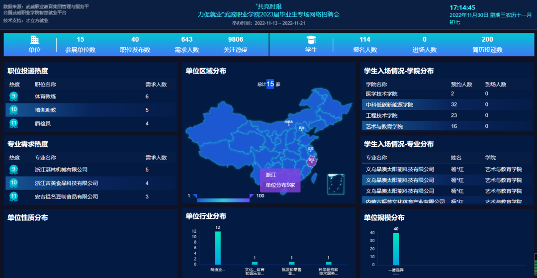 本次云聘系列活動(dòng)分兩個(gè)階段舉行,第一階段為“共克時(shí)艱力促就業(yè)”武威職業(yè)學(xué)院2023屆畢業(yè)生專場網(wǎng)絡(luò)招聘會(huì),于11月7日至11月21日舉行。本次招聘會(huì)主要面向在疫情條件下,能夠?qū)\嚱舆\(yùn)學(xué)生赴企業(yè)就業(yè)的單位。湖州市安吉縣人力資源和社會(huì)保障局組織10余家當(dāng)?shù)仄髽I(yè)參加了本次招聘會(huì),同時(shí)吸引內(nèi)蒙古靈圣作物科技有限公司、江蘇京東信息技術(shù)有限公司、義烏晶澳太陽能科技有限公司、內(nèi)蒙古振慧文化體育產(chǎn)業(yè)有限公司等企業(yè)參加,提供招聘職位40個(gè),需求人數(shù)643人,招聘會(huì)關(guān)注人次達(dá)9806,200余人投遞簡歷。