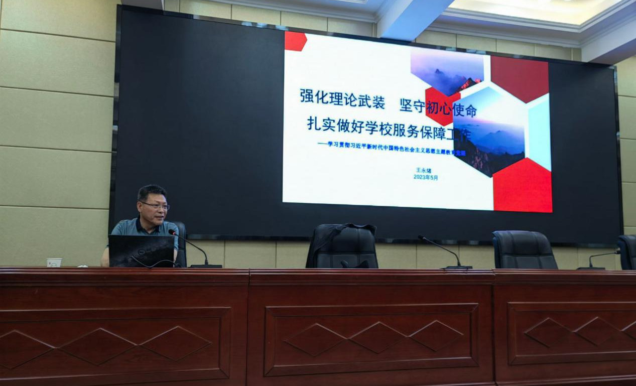 5月30日,學(xué)校黨委委員、副校長王永緒以《強(qiáng)化理論武裝?堅守初心使命——扎實(shí)做好學(xué)校服務(wù)保障工作》為題,在學(xué)校行樹樓北側(cè)學(xué)術(shù)報告廳講授學(xué)習(xí)貫徹習(xí)近平新時代中國特色社會主義思想主題教育專題黨課。后勤管理處黨員、干部職工參加黨課學(xué)習(xí)。