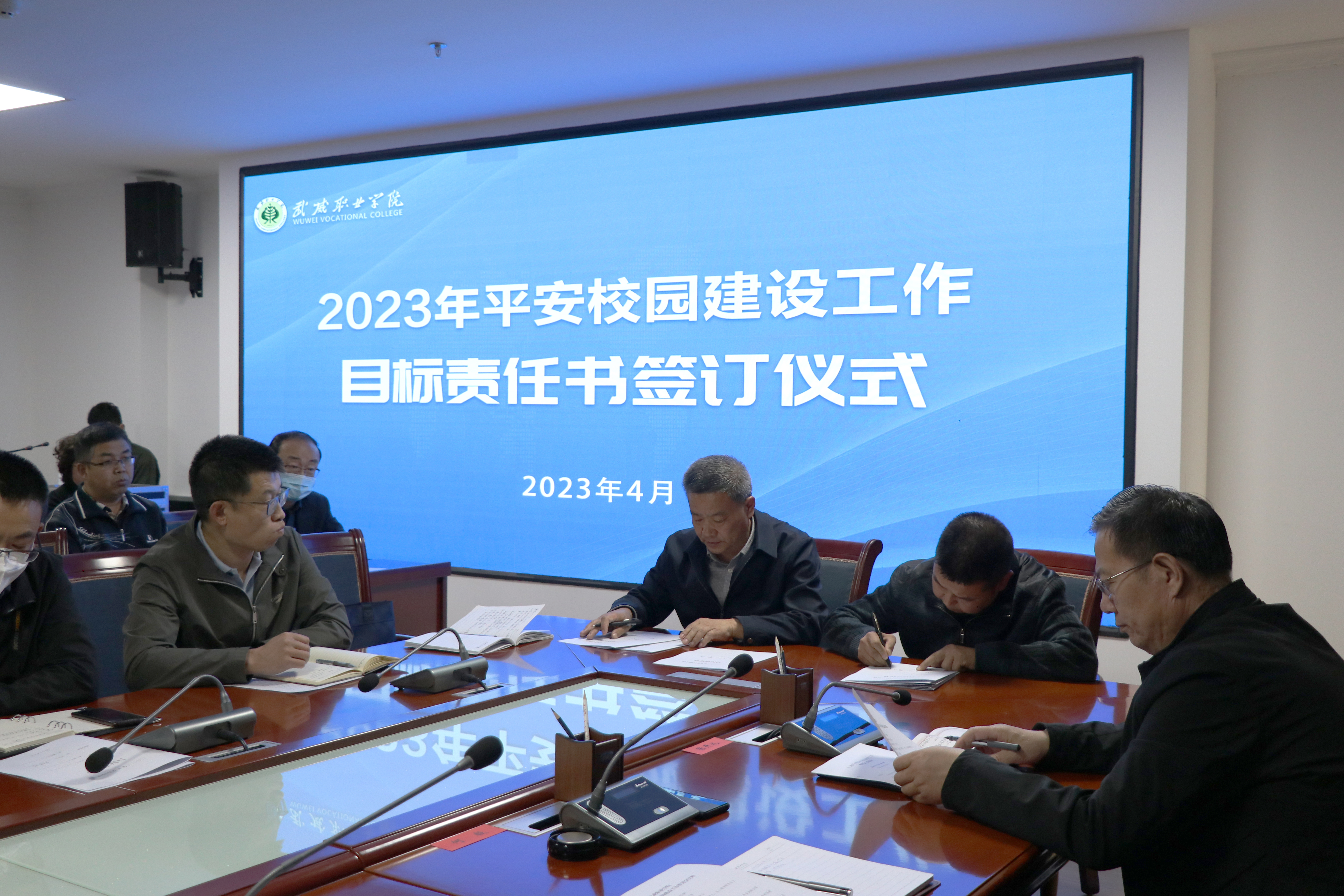 趙明與各部門、二級學(xué)院簽訂了2023年平安校園建設(shè)工作目標(biāo)責(zé)任書。王守云結(jié)合學(xué)校實(shí)際,對2023年平安校園建設(shè)工作作了安排。