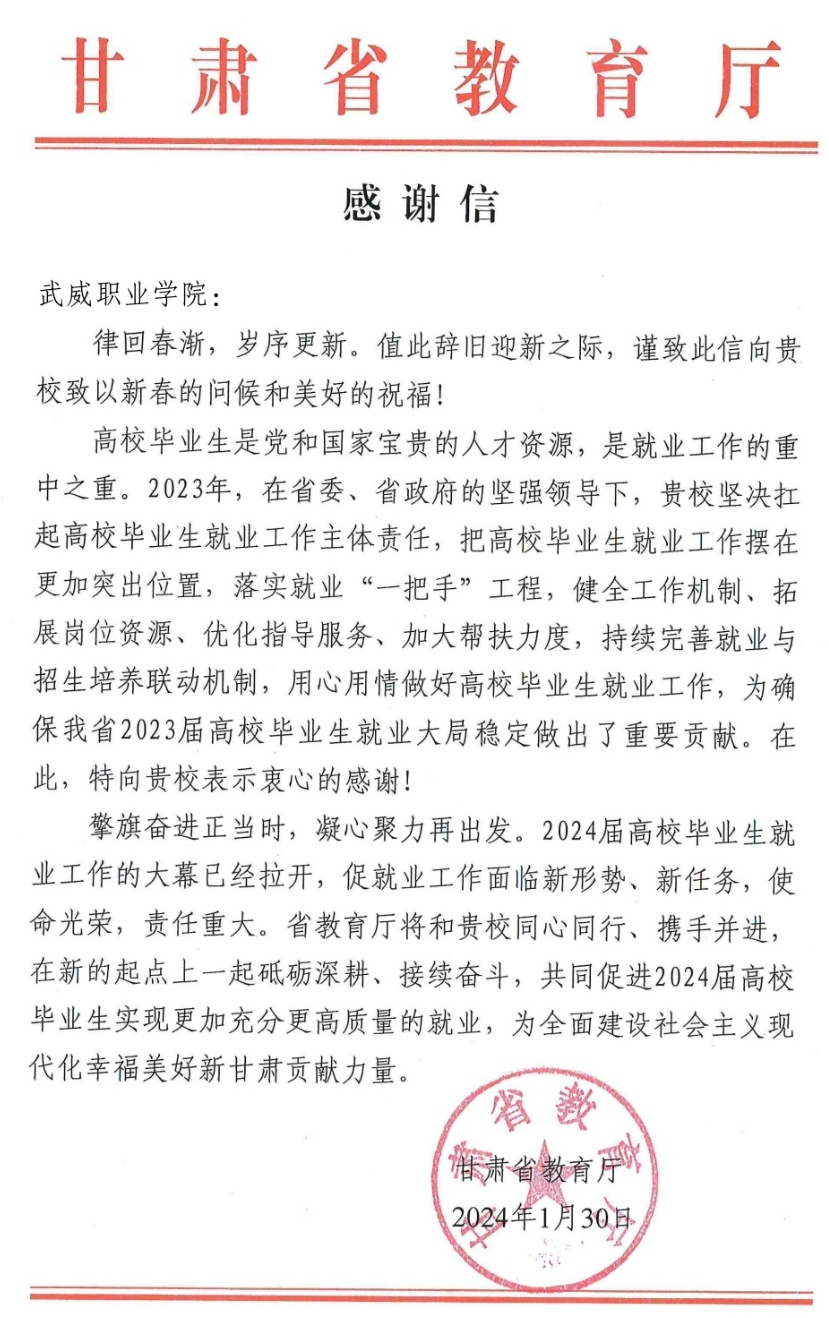 近日,甘肅省教育廳向我校發(fā)來感謝信,信中對學(xué)校為2023屆高校畢業(yè)生就業(yè)工作做出的重要貢獻(xiàn)致以感謝,對學(xué)校在高校畢業(yè)生就業(yè)工作中的突出表現(xiàn)作出肯定,表揚學(xué)校堅決扛起高校畢業(yè)生就業(yè)工作主體責(zé)任,把高校畢業(yè)生就業(yè)工作擺在更加突出位置,落實就業(yè)“一把手”工程,健全工作機(jī)制、拓展崗位資源、優(yōu)化指導(dǎo)服務(wù)、加大幫扶力度,持續(xù)完善就業(yè)與招生培養(yǎng)聯(lián)動機(jī)制,用心用情做好高校畢業(yè)生就業(yè)工作。