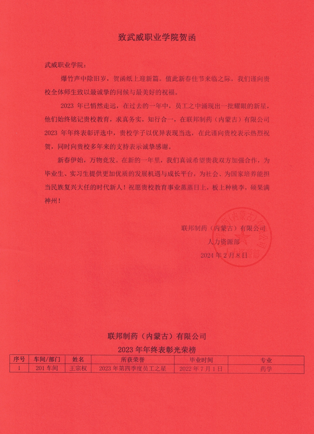 2月初,聯(lián)邦制藥(內(nèi)蒙古)有限公司向?qū)W校發(fā)來賀信,在信中感謝學(xué)校輸送眾多優(yōu)秀畢業(yè)生,表彰畢業(yè)生在工作中取得的優(yōu)異成績。其中,2022屆畢業(yè)生王宗權(quán)榮獲企業(yè)2023年第四季度員工之星。此外,聯(lián)邦制藥(內(nèi)蒙古)有限公司表示愿與學(xué)校繼續(xù)加強(qiáng)校企合作,共同為畢業(yè)生提供更加優(yōu)質(zhì)的發(fā)展機(jī)遇與成長平臺,為社會、為國家培養(yǎng)能擔(dān)當(dāng)民族復(fù)興大任的時代新人!