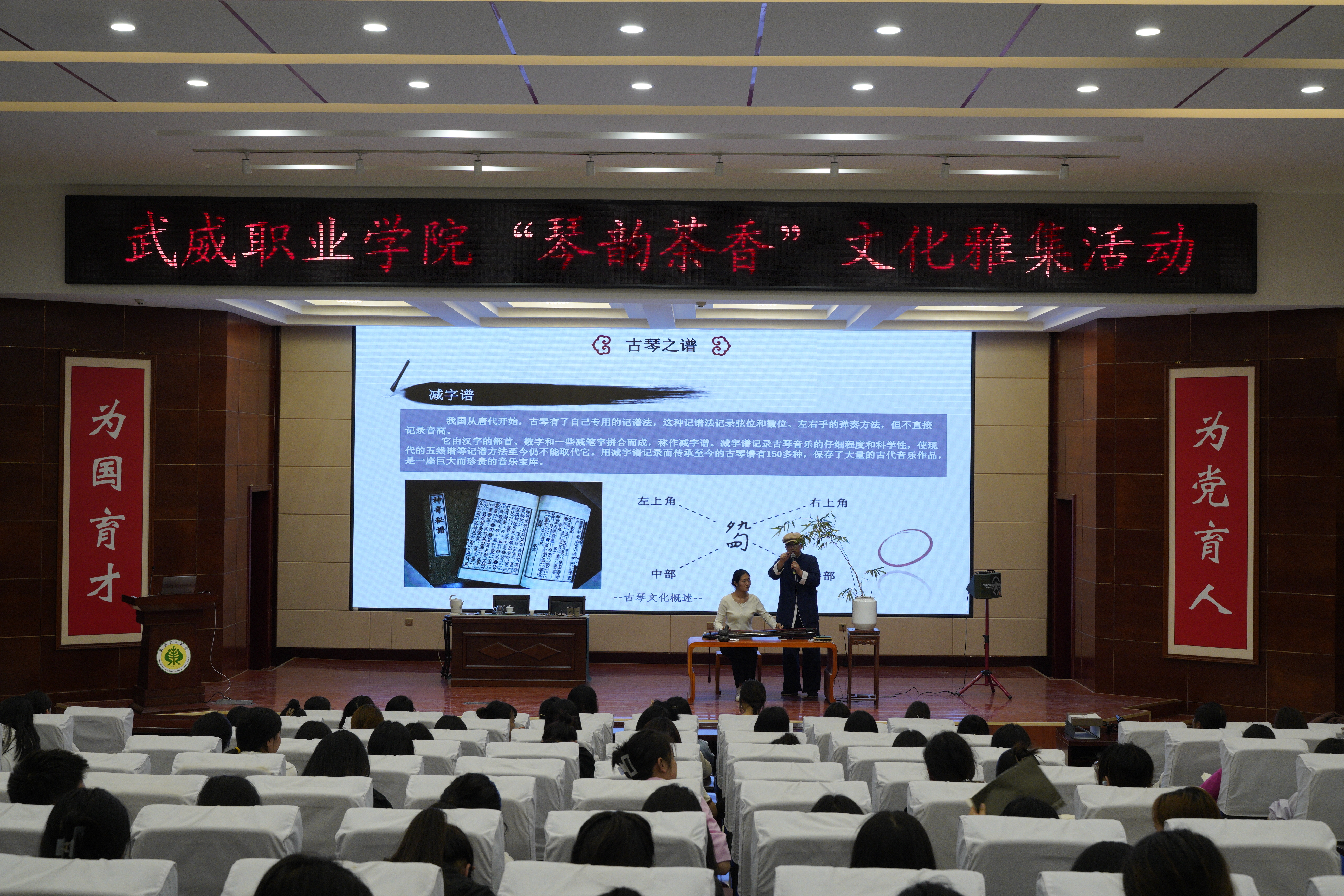 自古以來,文人雅士都曉韻律,善七弦,諳茶道。古琴和茶藝承載著豐富的歷史和文化內(nèi)涵,是中國傳統(tǒng)文化的重要代表之一。為了使學(xué)生可以更好地了解和傳承中華傳統(tǒng)文化的精髓和特點,推動傳統(tǒng)文化發(fā)展創(chuàng)新,近日,傳統(tǒng)文化體驗中心邀請到武威古琴協(xié)會會長霍宏昌及其團隊,在學(xué)校菁英廳開展“琴韻茶香”文化雅集活動。