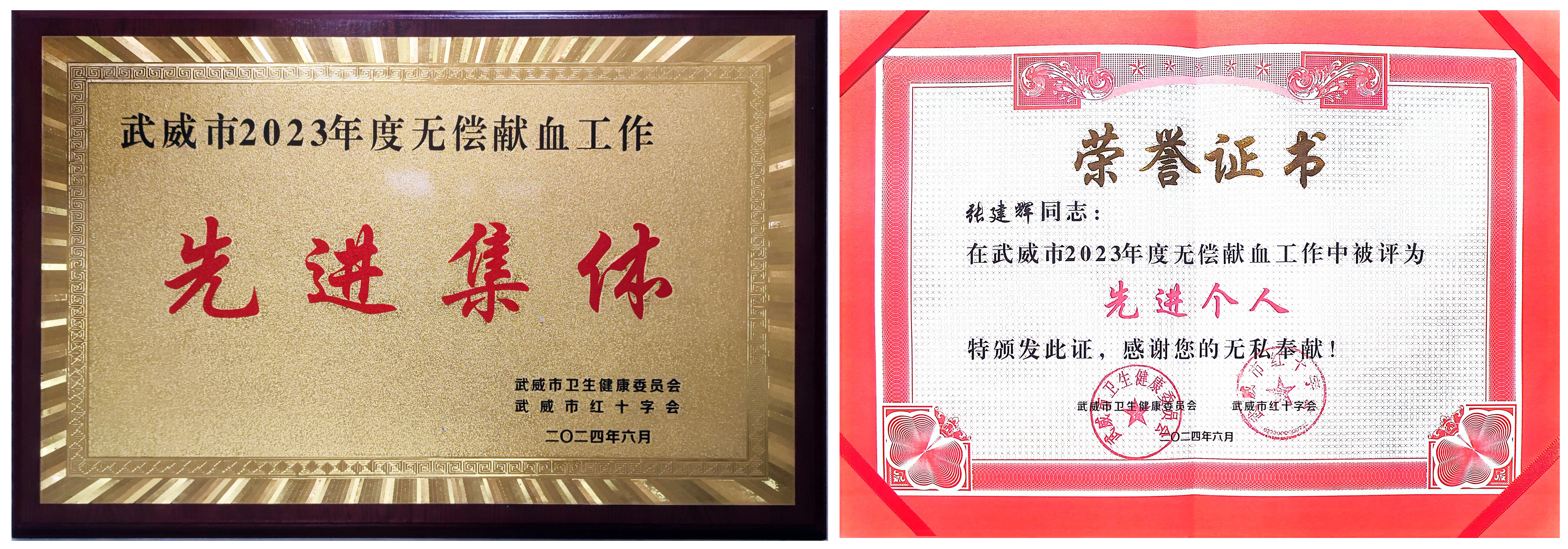 6月14日上午,我市2024年“6·14”世界獻(xiàn)血者日暨《武威市獻(xiàn)血條例》頒布宣傳活動(dòng)在南城門廣場(chǎng)舉辦。市人大常委會(huì)副主任劉光美宣讀《條例》頒布公告,并為全市2023年度無(wú)償獻(xiàn)血工作先進(jìn)集體、應(yīng)急獻(xiàn)血先進(jìn)集體和先進(jìn)個(gè)人頒發(fā)獎(jiǎng)牌和榮譽(yù)證書。學(xué)校被評(píng)為武威市2023年度無(wú)償獻(xiàn)血工作先進(jìn)集體,1名教師被評(píng)為先進(jìn)個(gè)人。