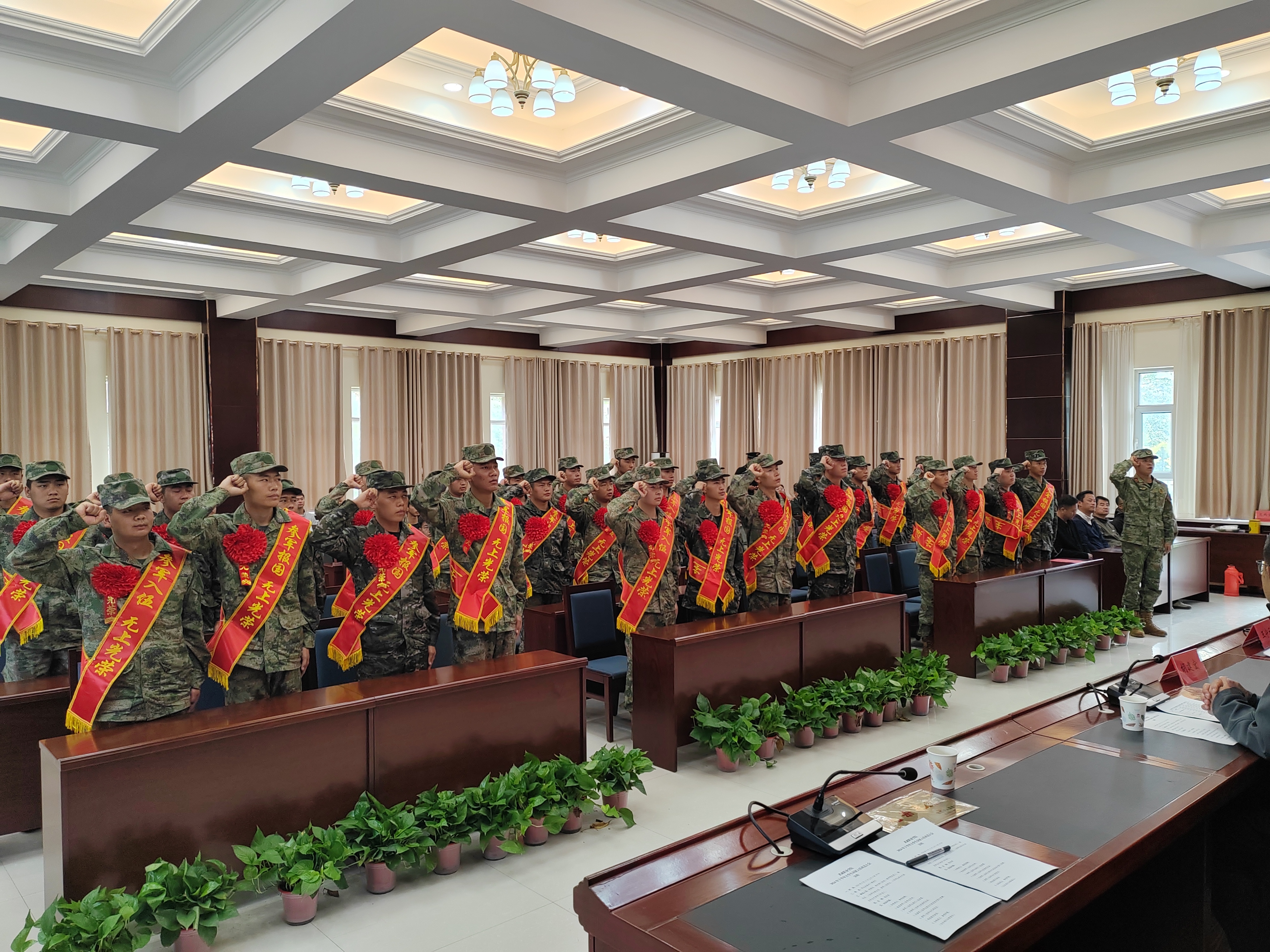 歡送大會上,入伍學生在退伍復學大學生代表的帶領下進行了鏗鏘有力的入伍宣誓,參會領導向學校所在地入伍的30名新兵佩戴大紅花并贈送紀念品,為入伍學生家長代表頒發(fā)“光榮之家”光榮牌。