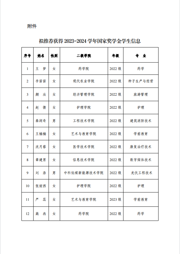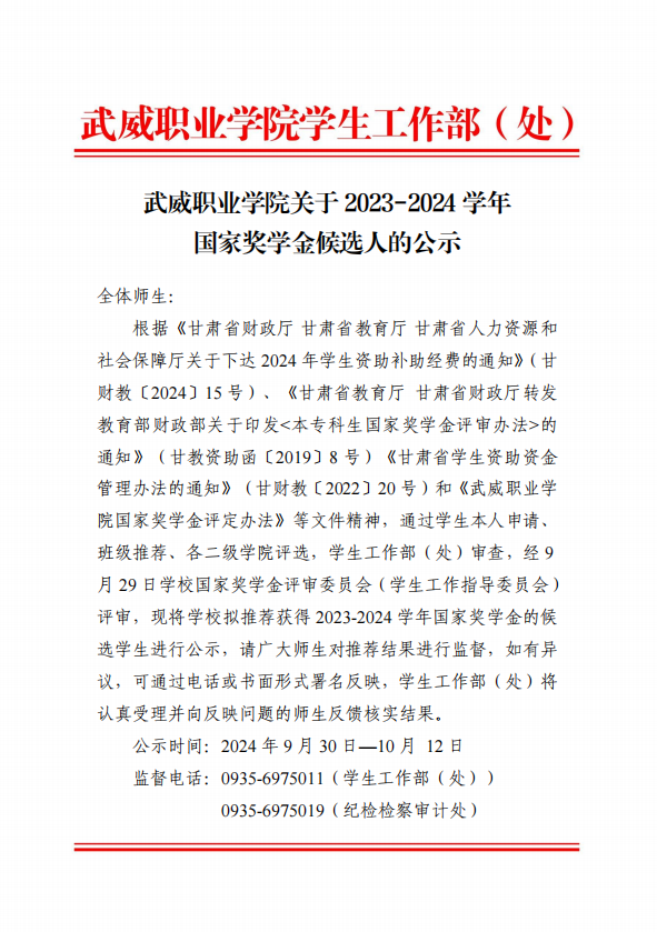 武威職業(yè)學院關(guān)于2023-2024學年國家獎學金候選人的公示