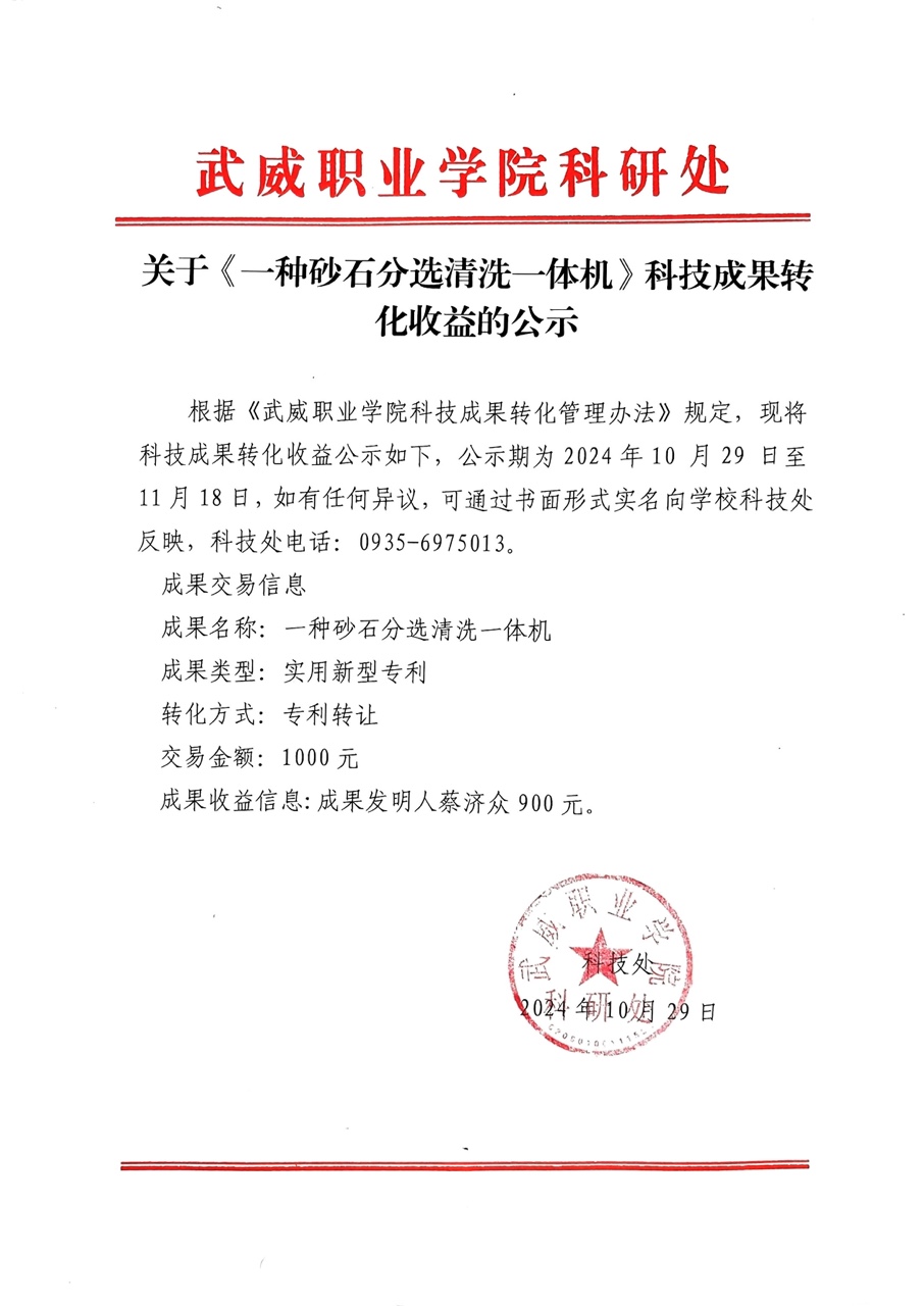 關于《一種砂石分選清洗一體機》科技成果轉(zhuǎn)化收益的公示