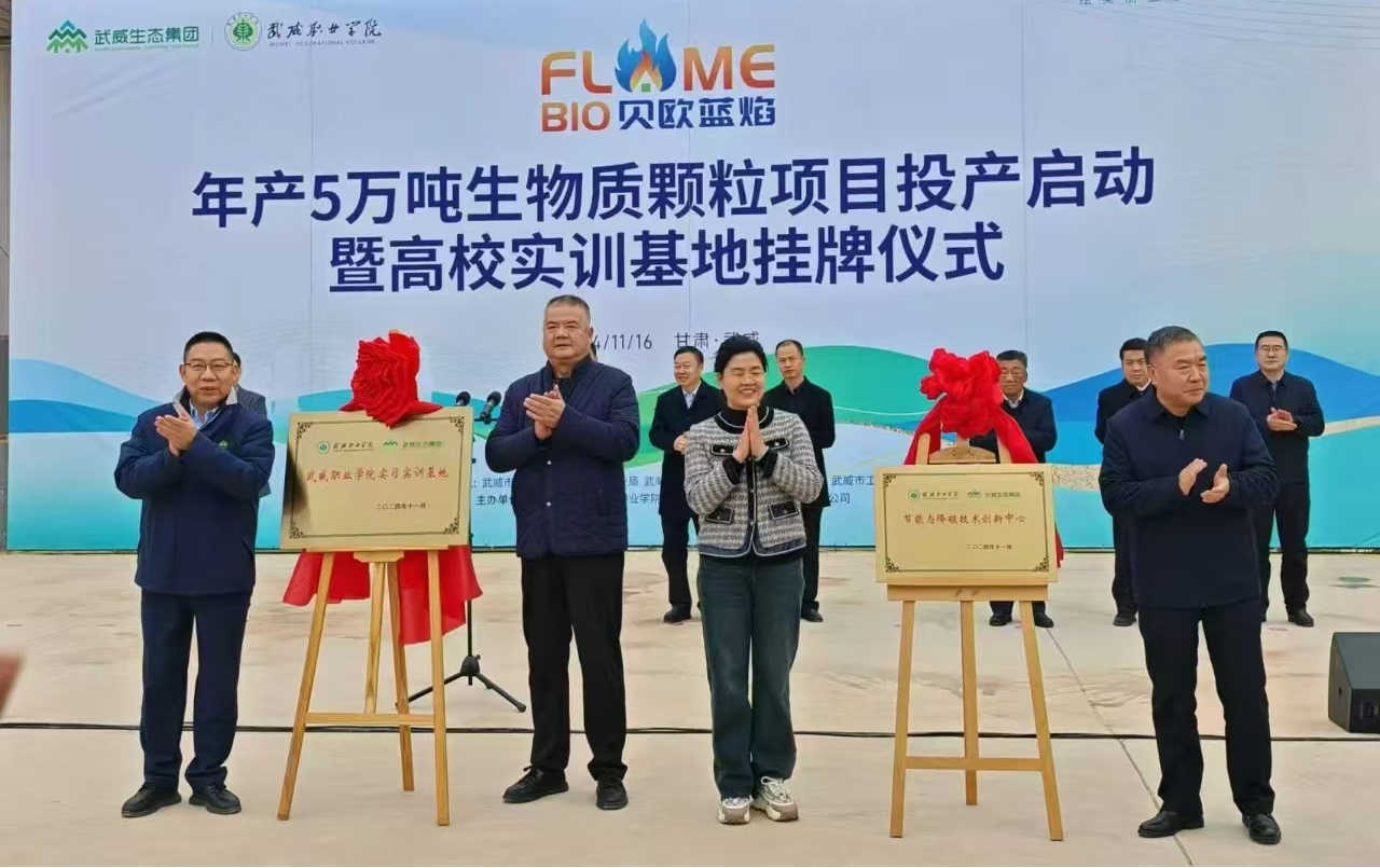 11月16日上午,由武威生態(tài)集團(tuán)和學(xué)校主辦,武威林草科技開(kāi)發(fā)有限公司承辦的武威生態(tài)集團(tuán)年產(chǎn)5萬(wàn)噸生物質(zhì)顆粒項(xiàng)目投產(chǎn)啟動(dòng)暨高校實(shí)訓(xùn)基地掛牌儀式在武威進(jìn)境木材指定監(jiān)管場(chǎng)地舉行。學(xué)校黨委委員、副校長(zhǎng)王守云出席儀式并致辭。