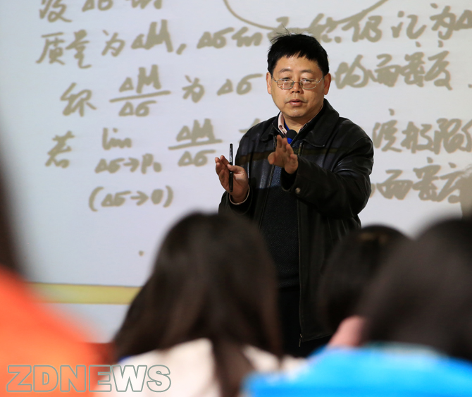 現(xiàn)在,蘇德礦上課用兩個(gè)話(huà)筒,一個(gè)掛在脖子上,一個(gè)放在講臺(tái)上,無(wú)論學(xué)生坐在哪個(gè)角落,都能聽(tīng)得清楚。他還像一個(gè)“舞臺(tái)監(jiān)督”一樣嚴(yán)格布置環(huán)境:教室第一排的窗簾必須拉上,以免大屏幕反光;幻燈片的紙片要用油性筆書(shū)寫(xiě),這樣投影到屏幕上的效果最清晰。——這樣的布局,就是能為學(xué)生能穩(wěn)定他們的注意力設(shè)計(jì)的,特別是,當(dāng)他們感覺(jué)“犯難”時(shí),蘇德礦能適時(shí)拋上一個(gè)“段子”,把學(xué)生分散的注意力拉回來(lái): “當(dāng)你喜歡一個(gè)人,他的一點(diǎn)變化你都看在眼里,別人都變成了常數(shù),TA才是唯一變量。” 這是在講解偏導(dǎo)函數(shù);他還用“存錢(qián)存銀行還是存余額寶”來(lái)解釋函數(shù)里的重要極限概念。在講一元復(fù)合函數(shù)求導(dǎo)的時(shí)候,他用來(lái)解釋的例子是:“就像最近來(lái)天氣突然熱起來(lái),你要脫衣服。脫到怎樣合適呢?一件一件脫,到不熱了為止。復(fù)合函數(shù)也一樣,一層一層求導(dǎo),直到內(nèi)函數(shù)的導(dǎo)數(shù)有公式,就成了。”又比如,說(shuō)“開(kāi)車(chē)為什么會(huì)撞樹(shù)?因?yàn)槌髽?shù)的方向,再一個(gè),就是車(chē)速太快。”蘇德礦先賣(mài)個(gè)了關(guān)子,接著把方向?qū)?shù)亮出來(lái),“在P點(diǎn)沿L方向的函數(shù)值的變化率,跟撞樹(shù)一樣,一個(gè)是方向,一個(gè)是速度。”
