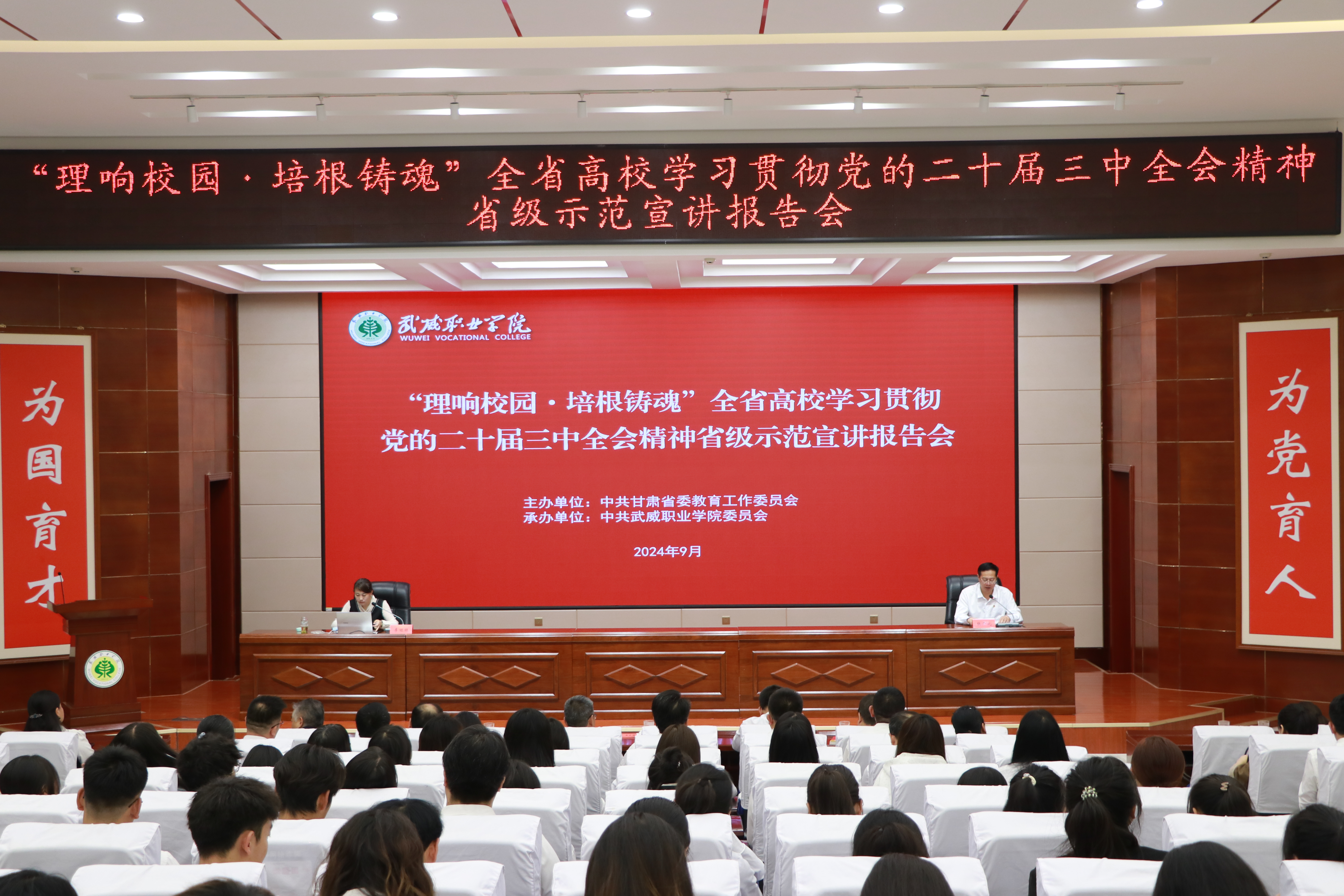 為全面深入學(xué)習(xí)宣傳貫徹黨的二十屆三中全會精神,堅(jiān)持不懈用黨的創(chuàng)新理論鑄魂育人,按照省委教育工委相關(guān)安排,9月8日下午,學(xué)校在菁英廳舉辦“理響校園·培根鑄魂”全省高校學(xué)習(xí)貫徹黨的二十屆三中全會精神省級示范宣講報(bào)告會。省委教育工委宣講團(tuán)成員、河西學(xué)院馬克思主義學(xué)院李婭婭副教授應(yīng)邀為我校師生作宣講報(bào)告。學(xué)校黨委班子成員、各部門、二級學(xué)院黨政負(fù)責(zé)人,教師代表,學(xué)生代表,共計(jì)220余人參加報(bào)告會。黨委副書記、校長張開禮主持報(bào)告會。