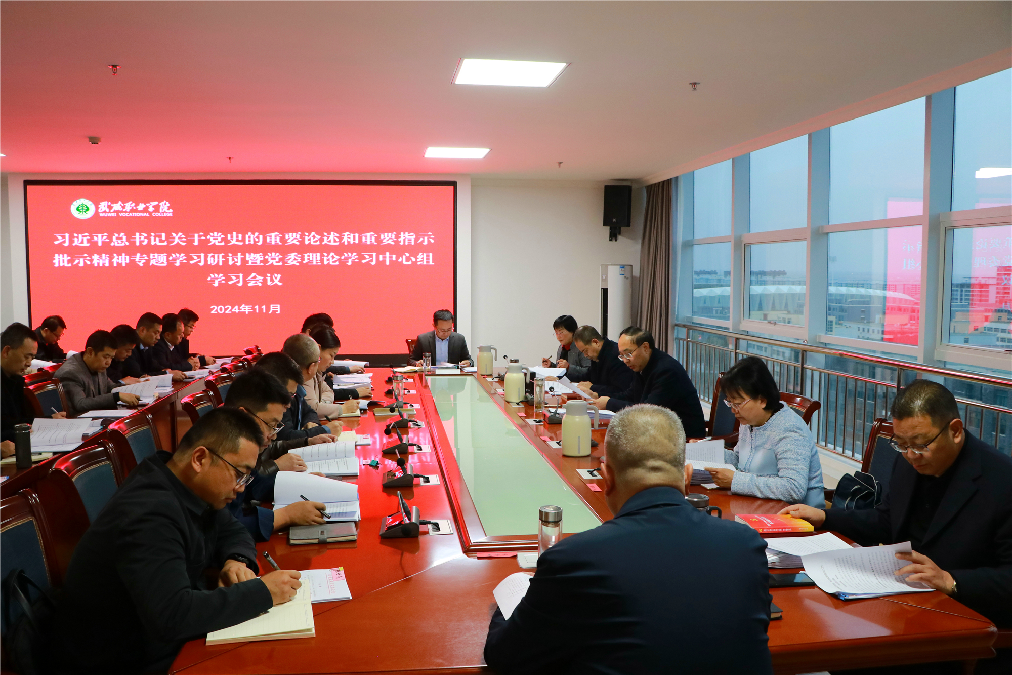 11月15日上午,學(xué)校召開(kāi)習(xí)近平總書(shū)記關(guān)于黨史的重要論述和重要指示批示精神專題學(xué)習(xí)研討暨黨委理論學(xué)習(xí)中心組學(xué)習(xí)會(huì)議。學(xué)校黨委領(lǐng)導(dǎo)班子成員,各部門(mén)、二級(jí)學(xué)院主要負(fù)責(zé)人,各黨總支與直屬黨支部書(shū)記參加學(xué)習(xí)會(huì)議。黨委書(shū)記王宏主持會(huì)議并講話。
