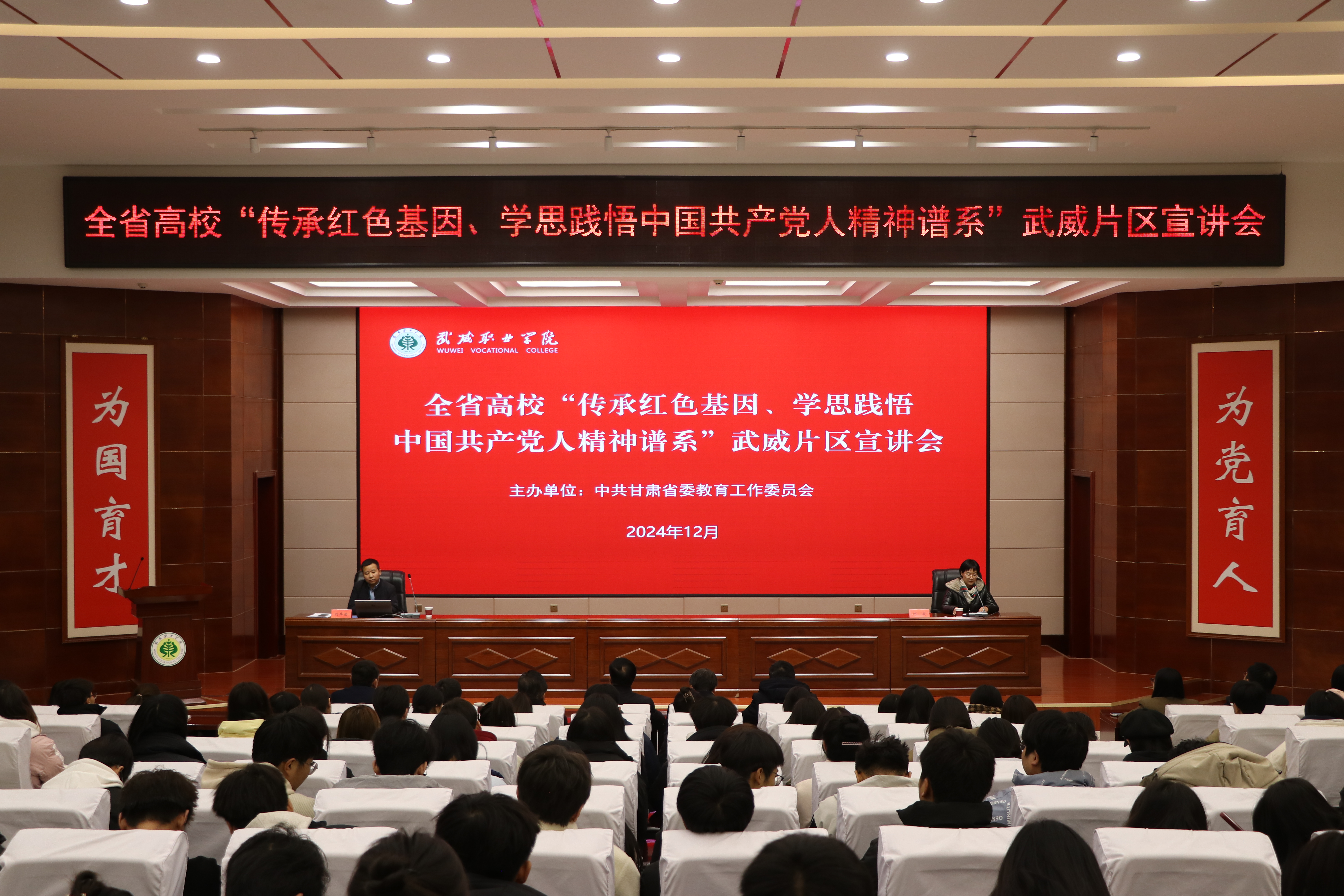 12月12日,由省委教育工委主辦,我校牽頭承辦的全省高?!皞鞒屑t色基因、學思踐悟中國共產(chǎn)黨人精神譜系”武威片區(qū)宣講會順利舉行。張掖市忠孝文化研習會會長魏亞勇、蘭州交通大學馬克思主義學院副院長劉華榮結合個人經(jīng)歷,聚焦紅色文化、鐵人精神等開展示范宣講。甘肅畜牧工程職業(yè)技術學院和我校師生代表共計200人聆聽了宣講。宣講會由黨委委員、副校長何毅主持。