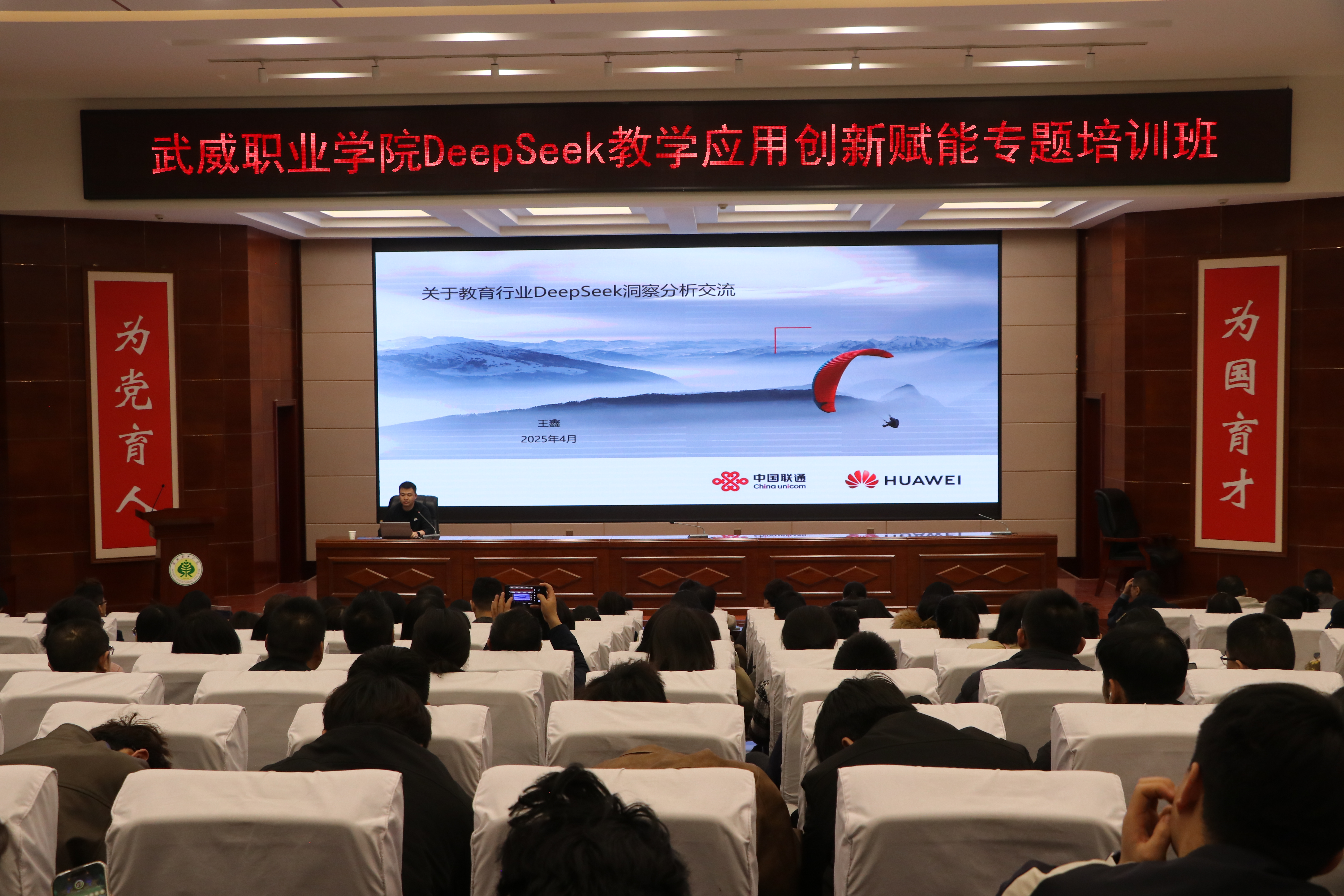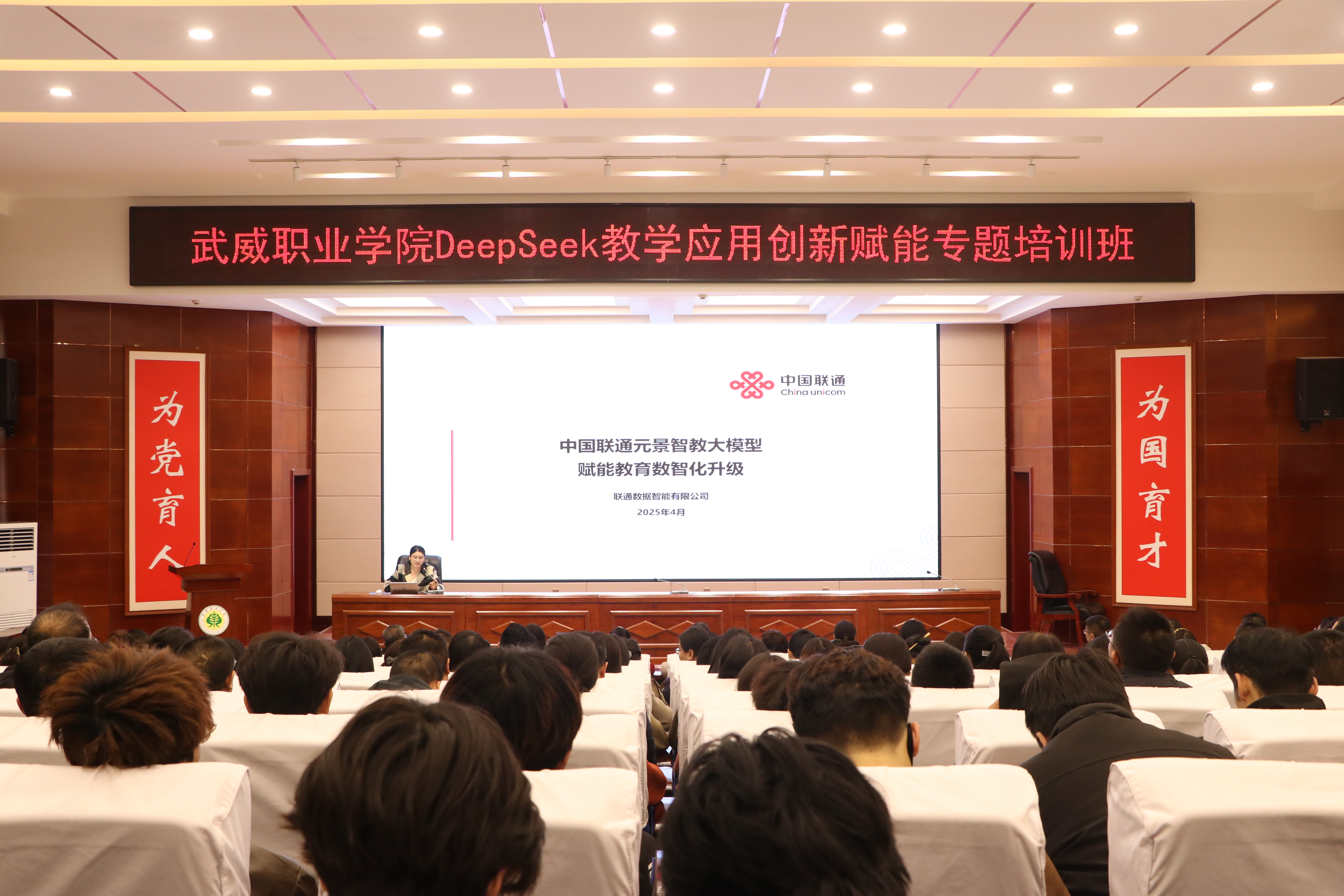 為深入探討DeepSeek技術(shù)的應(yīng)用,助力學(xué)校師生運(yùn)用AI工具進(jìn)行教學(xué)實(shí)踐、智慧課程建設(shè)與科學(xué)研究工作,為教學(xué)改革與教學(xué)創(chuàng)新實(shí)踐筑基賦能。4月3日,學(xué)校邀請(qǐng)聯(lián)通數(shù)據(jù)智能有限公司教育行業(yè)解決方案專(zhuān)家包紅梅和華為技術(shù)有限公司智算產(chǎn)業(yè)AI架構(gòu)師王鑫,舉辦了“DeepSeek教學(xué)應(yīng)用創(chuàng)新賦能”專(zhuān)題講座。講座由網(wǎng)絡(luò)安全與信息技術(shù)中心負(fù)責(zé)人史子新主持,學(xué)校各部門(mén)、二級(jí)學(xué)院教師代表,信息技術(shù)學(xué)院學(xué)生代表共計(jì)220人參加。