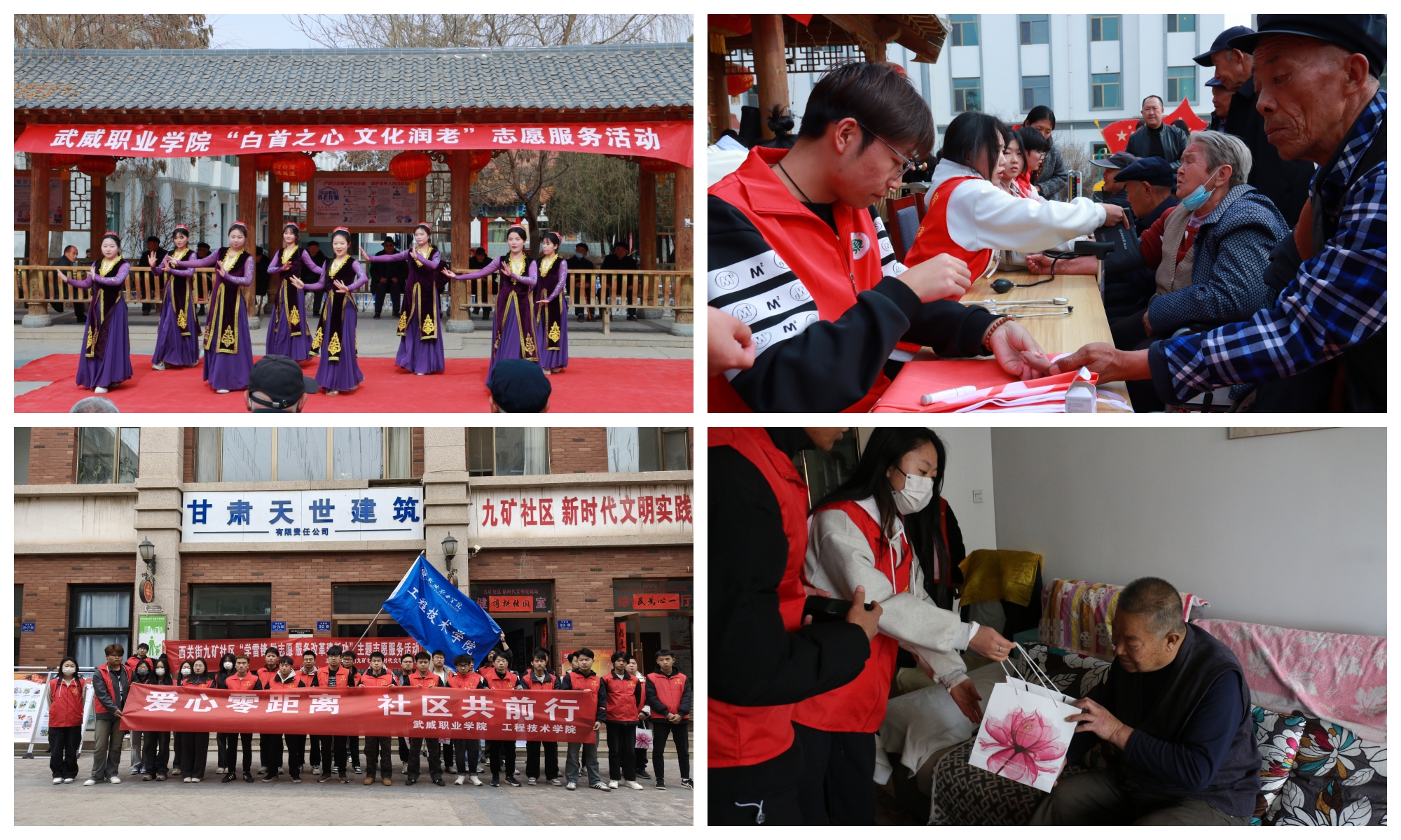 開展愛(ài)老敬老志愿服務(wù)活動(dòng)。3月21日,校團(tuán)委組織50余名護(hù)理和學(xué)前教育專業(yè)志愿者,前往涼州區(qū)中心敬老院開展“白首之心·文化潤(rùn)老”志愿服務(wù)活動(dòng),為老人捐贈(zèng)生活用品和愛(ài)心物資,開展文藝表演慰問(wèn)演出,為老人測(cè)量血壓、血糖,告知在日常生活起居中的注意事項(xiàng),以專業(yè)技能守護(hù)老人健康。3月5日,工程技術(shù)學(xué)院35名志愿者走進(jìn)西關(guān)街九條嶺礦區(qū)社區(qū),開展“愛(ài)心零距離社區(qū)共前行”志愿服務(wù)活動(dòng),為社區(qū)孤寡老人、獨(dú)居老人和老黨員等特殊家庭送上慰問(wèn)品,打掃衛(wèi)生、擦拭家具,幫忙照料綠植,并與社區(qū)工作者一起規(guī)范擺放社區(qū)內(nèi)亂停亂放的自行車、電動(dòng)車,清潔窗戶、地面,營(yíng)造整潔有序的社區(qū)環(huán)境。