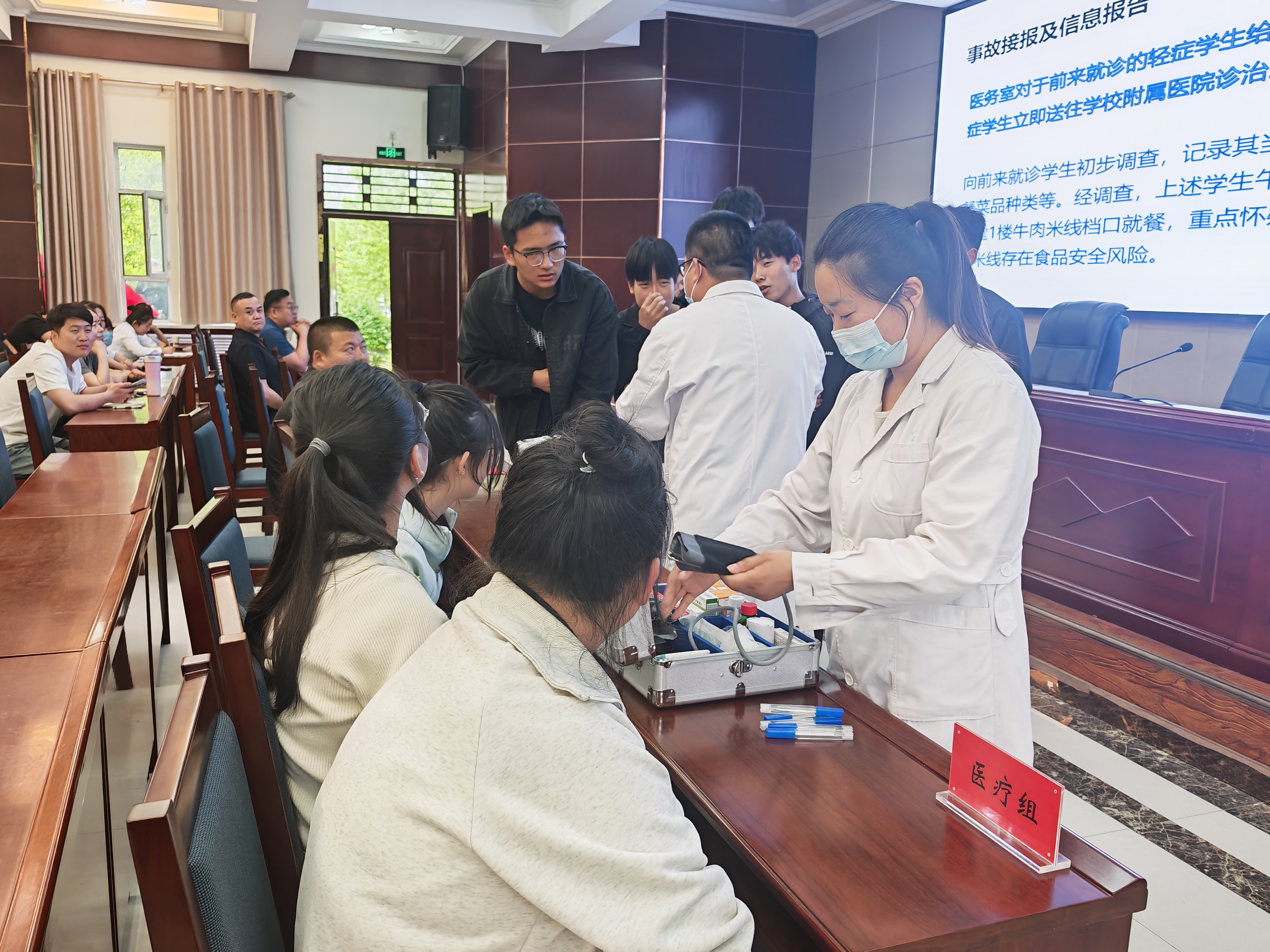 演練采取“事故模擬+場景切換+政策解讀”的方式,模擬醫(yī)學技術(shù)學院8名學生發(fā)生群體性食物中毒后,學校立即啟動《食品安全事故應(yīng)急預(yù)案》進行應(yīng)急處置的全過程。在事故模擬、組織先期處置、啟動應(yīng)急響應(yīng)、配合參與現(xiàn)場應(yīng)急處置、輿情管控、應(yīng)急響應(yīng)終止、點評與總結(jié)七大場景的應(yīng)急處置過程中,融合了學生救治與心理疏導、快速響應(yīng)與報告、現(xiàn)場與證據(jù)保護、配合調(diào)查與檢測、輿情監(jiān)測與應(yīng)對、善后處置等要素,體現(xiàn)了校內(nèi)快速聯(lián)動、校外有序協(xié)同的特點。