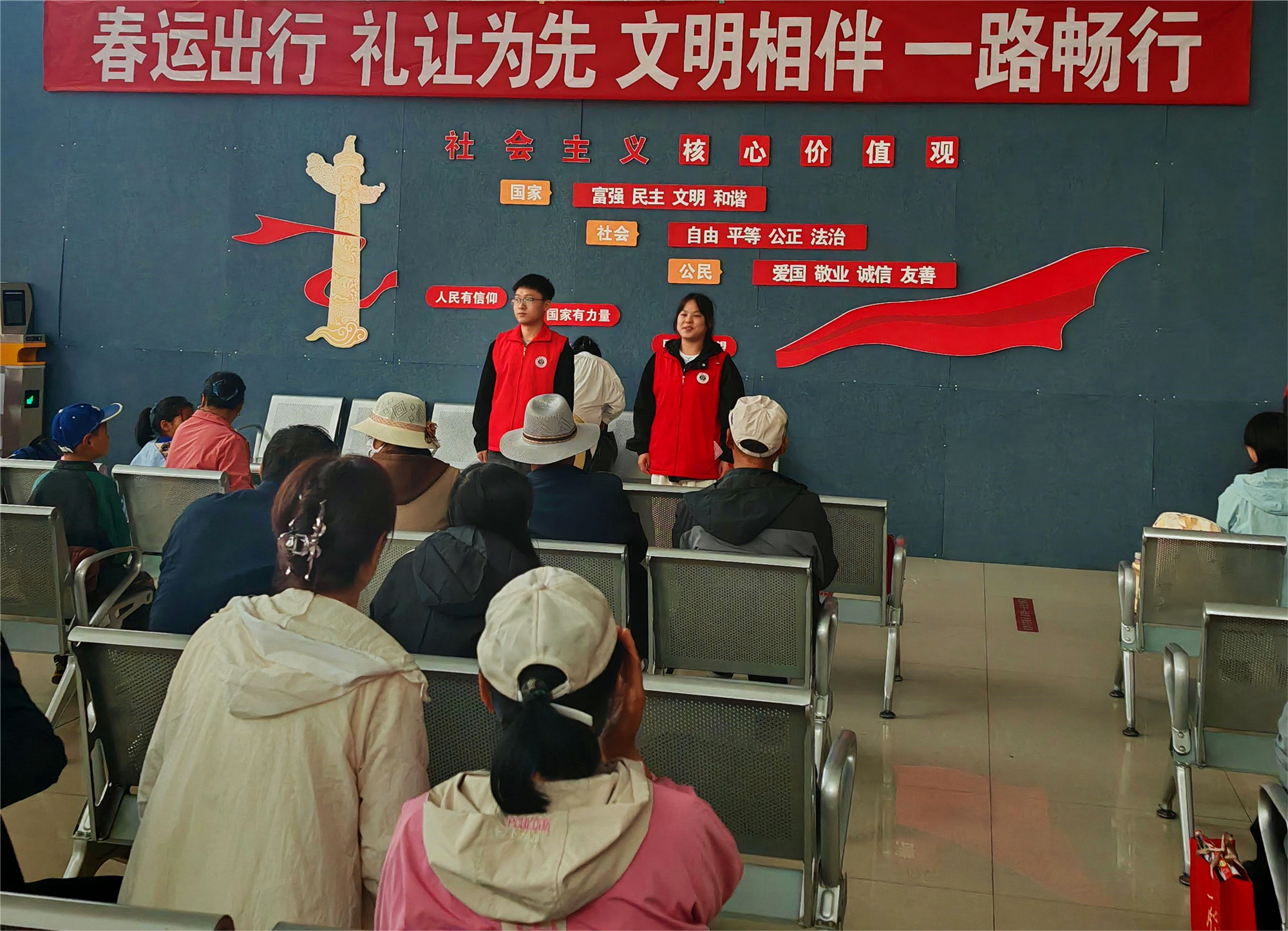 活動現(xiàn)場,志愿者們通過豐富多彩的形式推廣普通話,宣傳文明交通新風(fēng)尚。在車站候車室,志愿者深情誦讀《祖國啊,我親愛的祖國》《黃河頌》等經(jīng)典篇目,吸引眾多候車乘客駐足聆聽。志愿者邀請車站內(nèi)的小旅客們一同參與朗誦,在互動中感受語言文字的魅力,營造了濃厚的文化氛圍。此外,團(tuán)隊還向乘客發(fā)放文明乘車、文明出行倡議書,倡導(dǎo)安全出行、文明乘車的良好風(fēng)尚。
