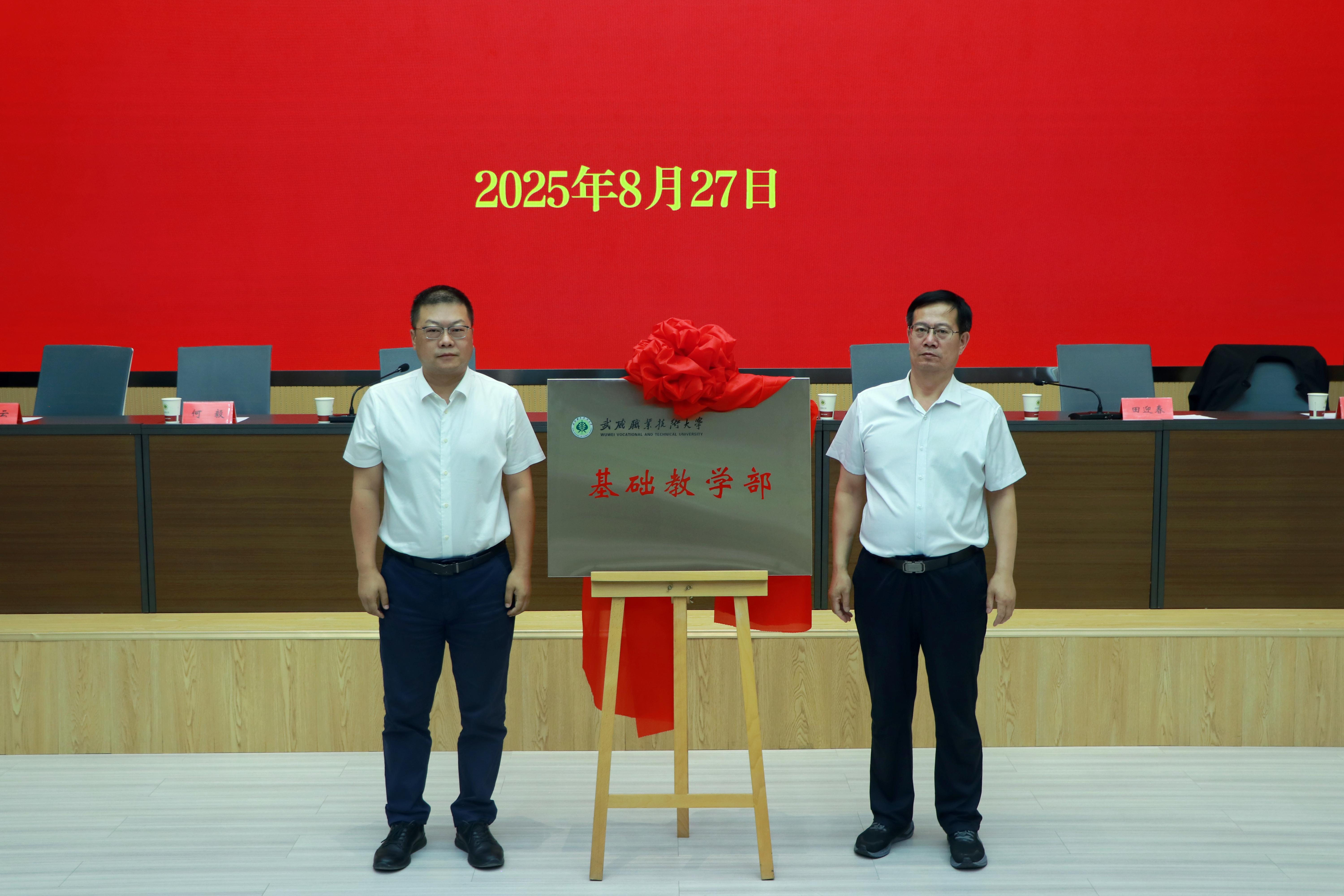 在全場熱烈的掌聲中,李海軍與張開禮共同為“基礎(chǔ)教學(xué)部”揭牌,標志著武威職業(yè)技術(shù)大學(xué)基礎(chǔ)教學(xué)部正式組建成立。