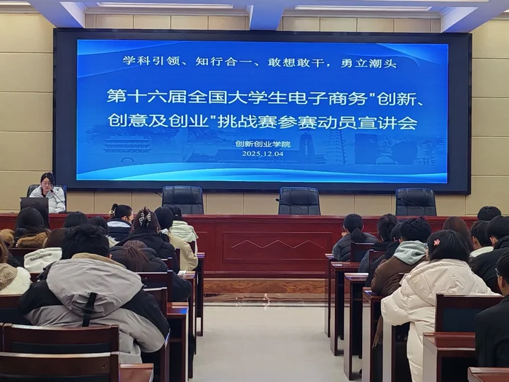 為積極備戰(zhàn)第十六屆全國大學(xué)生電子商務(wù)“創(chuàng)新、創(chuàng)意及創(chuàng)業(yè)”挑戰(zhàn)賽,激發(fā)學(xué)生參賽熱情,提升項(xiàng)目質(zhì)量,創(chuàng)新創(chuàng)業(yè)學(xué)院于12月4日在行樹樓北側(cè)報(bào)告廳舉行大賽動(dòng)員宣講會。來自全校9個(gè)學(xué)院的師生代表共計(jì)120人參加了本次動(dòng)員會。
