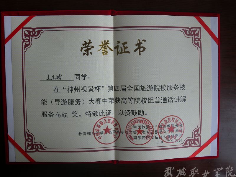 經(jīng)濟(jì)管理系晉藝波老師指導(dǎo)我系旅游管理、酒店管理專(zhuān)業(yè)學(xué)生參加2012年“神州視景杯”第四屆全國(guó)旅游院校服務(wù)技能(導(dǎo)游技能)大賽,榮獲優(yōu)秀獎(jiǎng)。