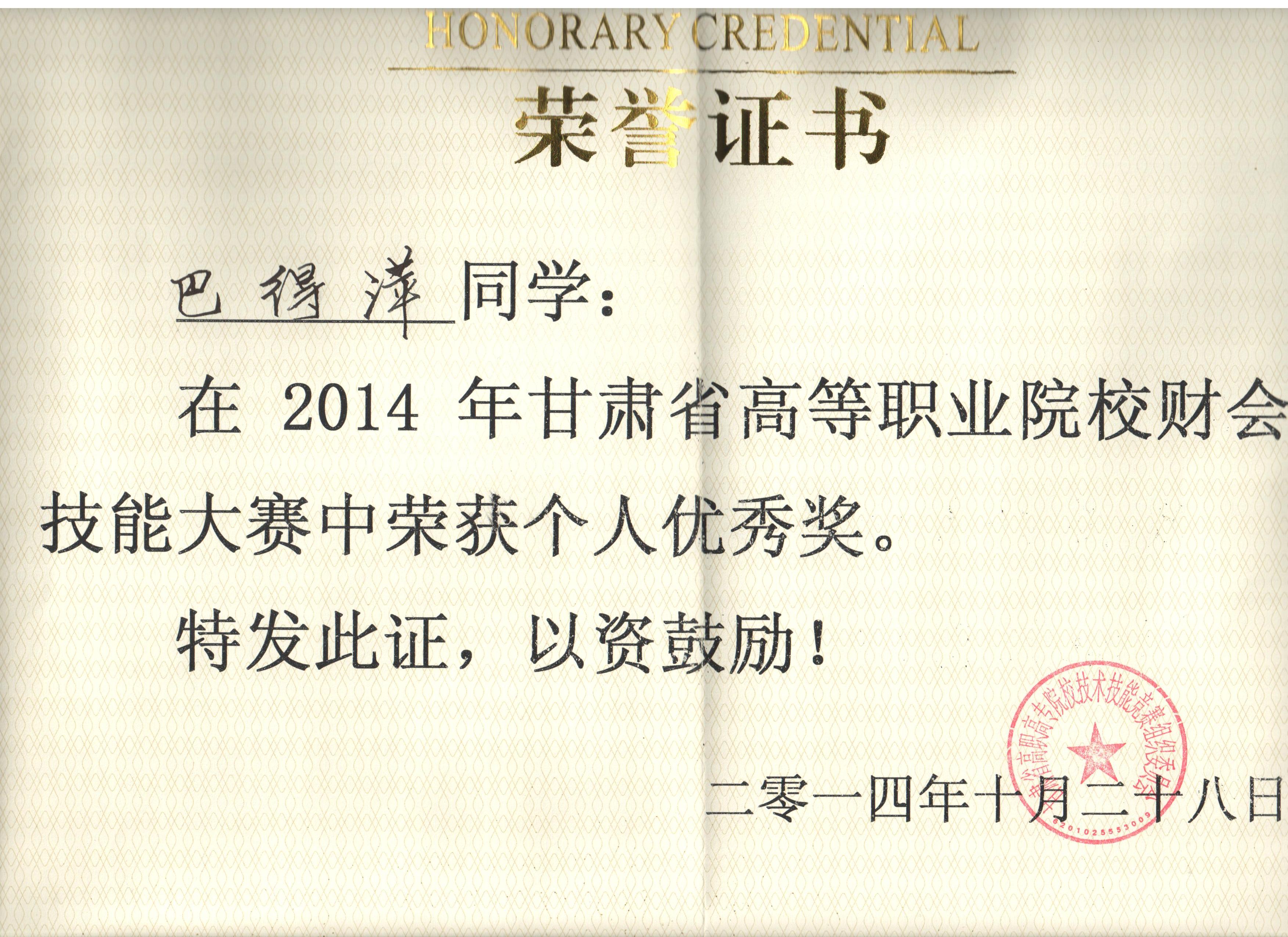 經(jīng)濟(jì)管理系李惠蘭、賀德赟老師指導(dǎo)我系會計專業(yè)學(xué)生參加2014年甘肅省高等職業(yè)學(xué)院財會技能大賽,榮獲優(yōu)秀獎。