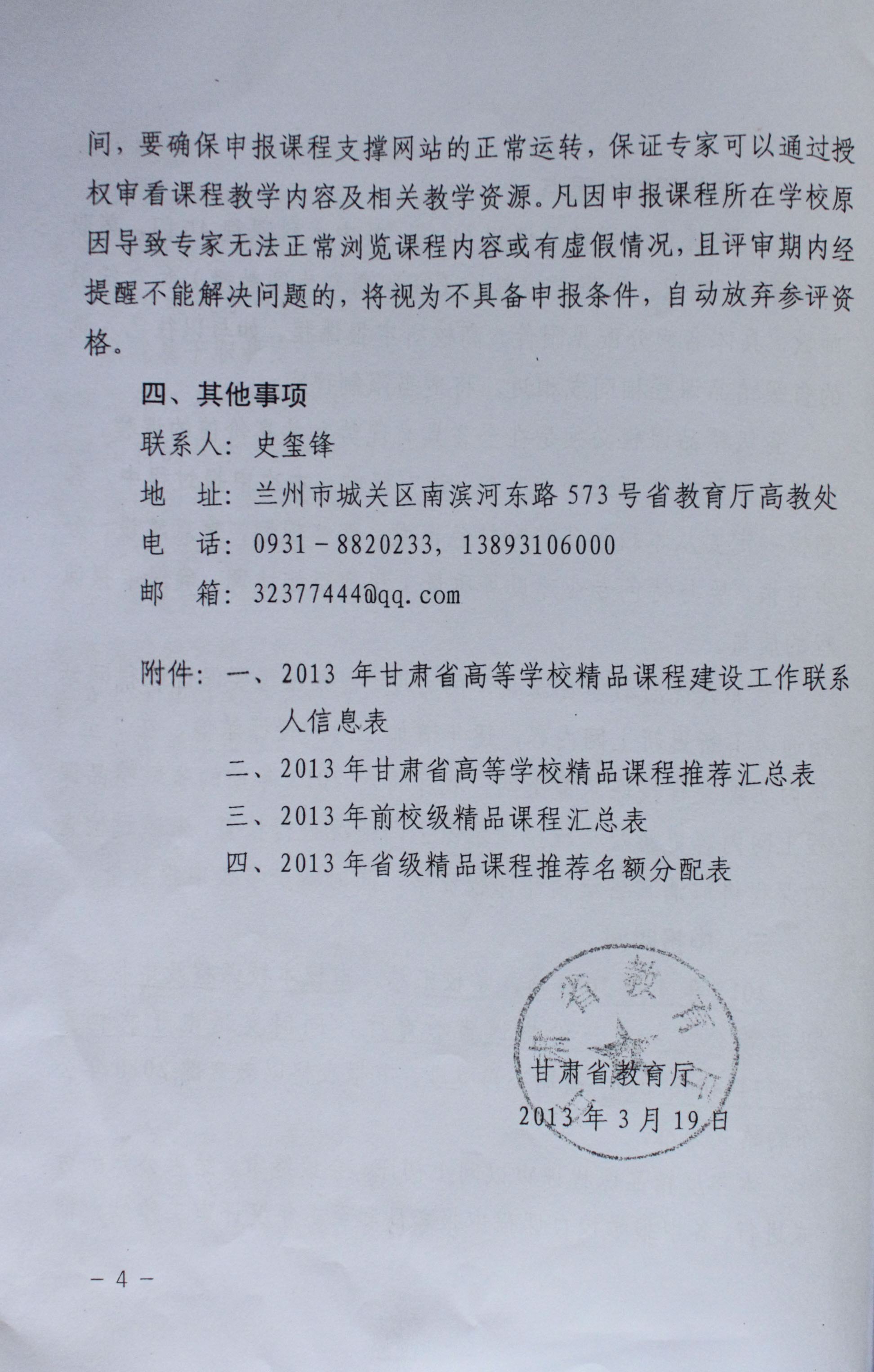 2.經(jīng)研究確定為推薦申報省級精品課程的,于4月18日前將定稿的2013年省級精品課程申報書電子檔傳至教務(wù)處趙曉麗處,申報表格以教育部2010年公布的格式為準(zhǔn)。