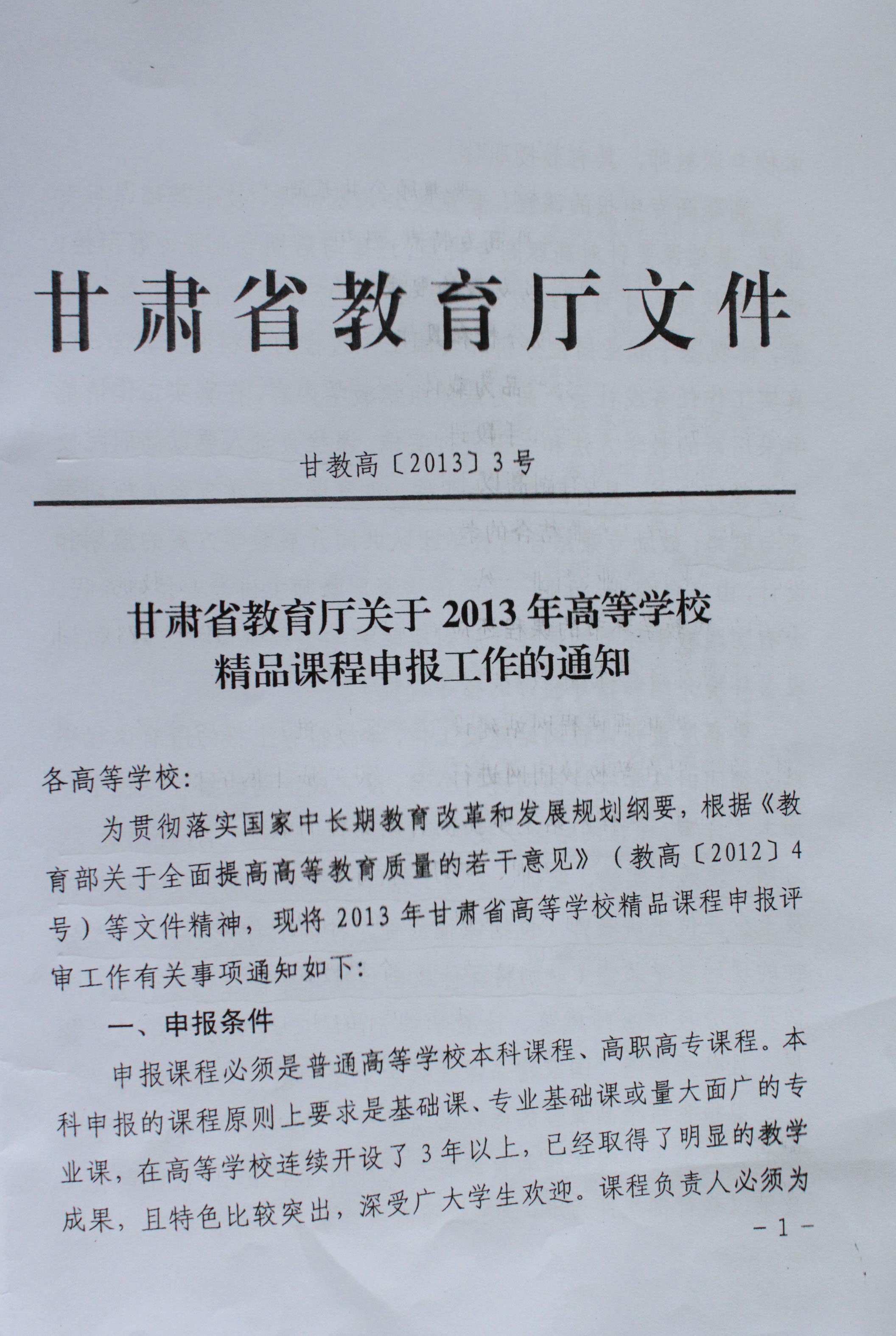 根據(jù)《甘肅省教育廳關(guān)于2013年高等學(xué)校精品課程申報工作的通知》(甘教高〔2013〕3號)文件要求,本年度省級精品課程申報時間提前,現(xiàn)就2013年度省級精品課程申報的有關(guān)事項安排如下: