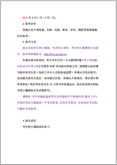 5.詳細信息請參看甘肅省教育考試院《關于做好2016年9月全國計算機等級考試網(wǎng)上報名工作的通知》(甘教考院〔2016〕95號文件)及《甘肅省2016下半年全國計算機等級考試公告》(已傳至群文件)。