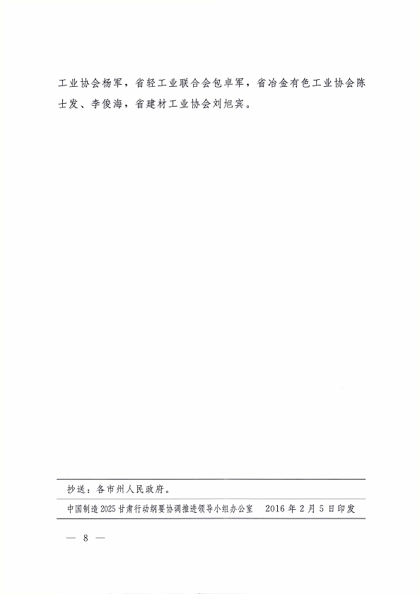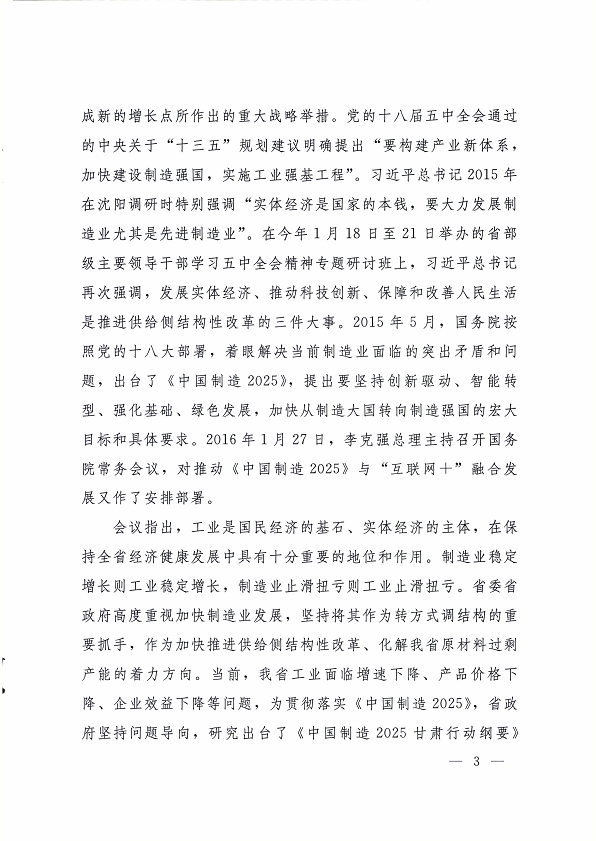 2016 年 1 月 30 日,省委副書記、省長、中國制造 2025甘肅行動綱要協(xié)調推進領導小組組長劉偉平主持召開了協(xié)調推進領導小組第一次會議,研究部署我省行動綱要的協(xié)調和推進工作?,F(xiàn)將《中國制造 2025 甘肅行動綱要協(xié)調推進領導小組第一次會議紀要》轉發(fā)你們。