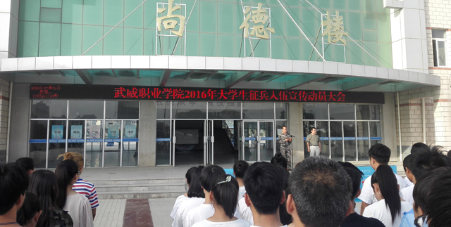 2016年7月5日早晨,學生工作處聯(lián)合院團委在學院尚德樓北廣場舉行了“武威職業(yè)學院2016年大學生應征入伍宣傳動員大會”。學院1000多名學生和各系輔導員參加了大會,學院武裝部部長王守云主持動員大會。