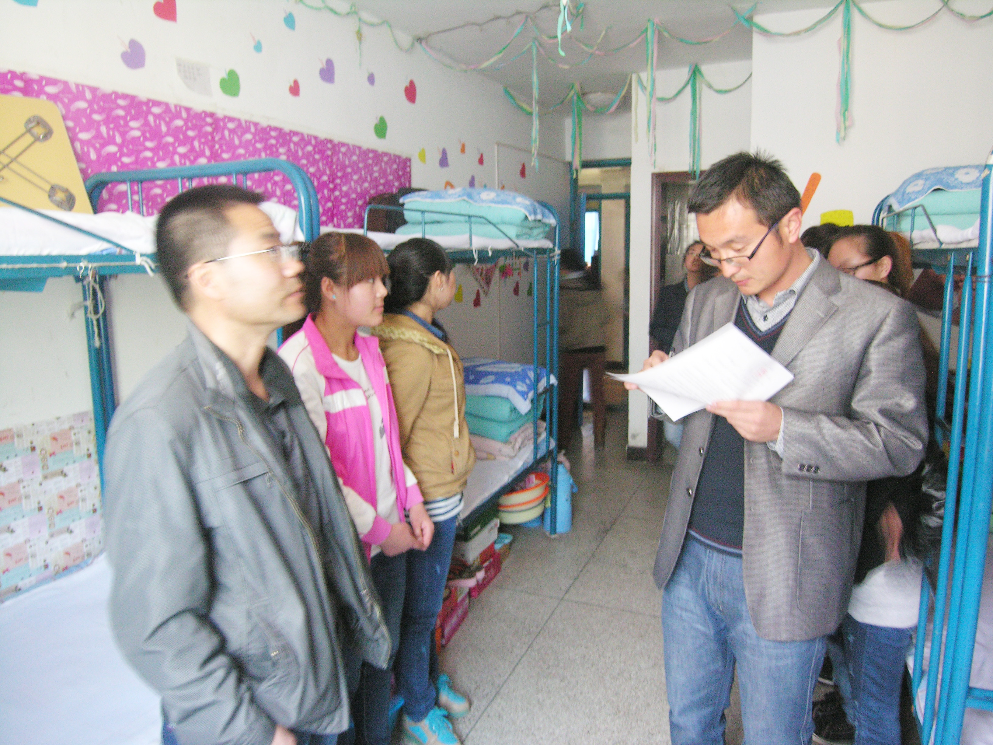 4月11日下午進(jìn)行了集中檢查評(píng)比,系黨總支書記張伯成、輔導(dǎo)員、各班主任及學(xué)生會(huì)干部擔(dān)任評(píng)委。本次活動(dòng)從講安全、講紀(jì)律、講衛(wèi)生、講文明禮貌等幾個(gè)方面進(jìn)行檢查評(píng)比,通過評(píng)選2-302、4-429、4-228等十間宿舍被評(píng)為文明宿舍。