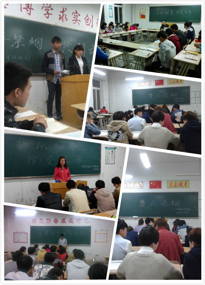 在班會中,各班主任向同學們宣讀了學院《關(guān)于在校園內(nèi)公共場所戒煙的通知》和《校園禁煙倡議書》,并提出作為一名學生,除了要有遠大的理想、高尚的情操、淵博的知識、嚴謹?shù)募o律作風外,還要有一個健康的身體。為了我們的健康,我們呼吁,同學們應(yīng)自覺的遠離香煙,并勸說吸煙的親友盡快戒煙。讓我們每一位同學做出承諾,自覺拒絕煙草,遠離煙草危害。堅決不吸煙,拒吸第一支煙,勸告他人不吸煙,不做吸煙的新一代。人人爭做文明、健康、遵紀守法的好學生,使每一位師生都擁有一個健康的生活環(huán)境。