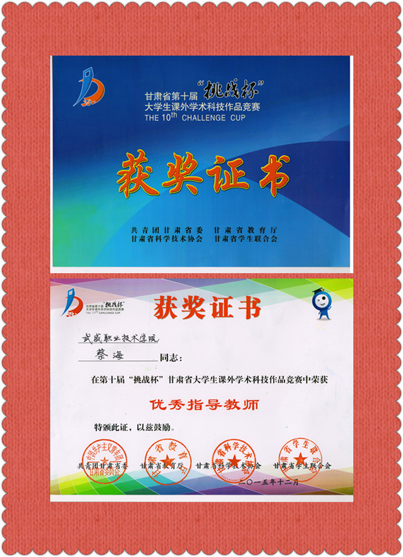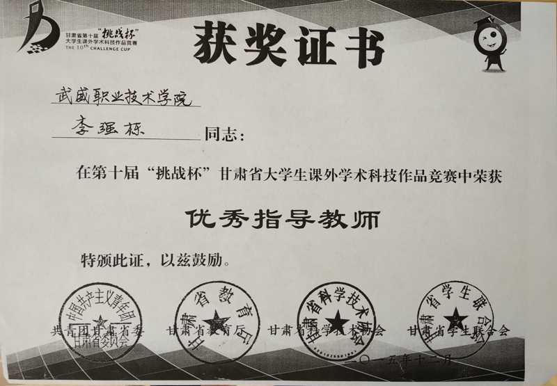 2015年6月23日,現(xiàn)代農(nóng)業(yè)技術(shù)系教師蔡海、李強(qiáng)棟赴西北師范大學(xué),參加由共青團(tuán)甘肅省委、甘肅省教育廳、甘肅省科學(xué)技術(shù)學(xué)會(huì)、甘肅省學(xué)生聯(lián)合會(huì)舉辦的甘肅省第十屆大學(xué)生“挑戰(zhàn)杯”大學(xué)生課外學(xué)術(shù)科技作品競(jìng)賽,獲得優(yōu)秀指導(dǎo)教師榮譽(yù)稱(chēng)號(hào)。