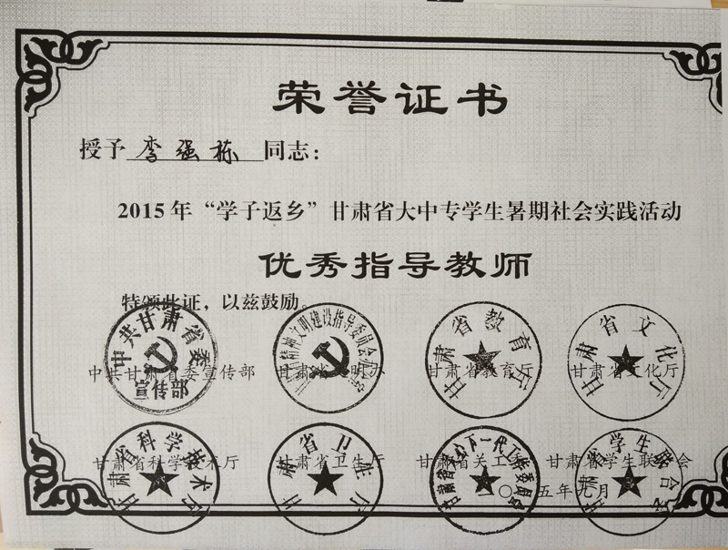李強棟榮獲2015年“學(xué)子返鄉(xiāng)”甘肅省大中專學(xué)生暑期社會實踐活動優(yōu)秀指導(dǎo)教師
