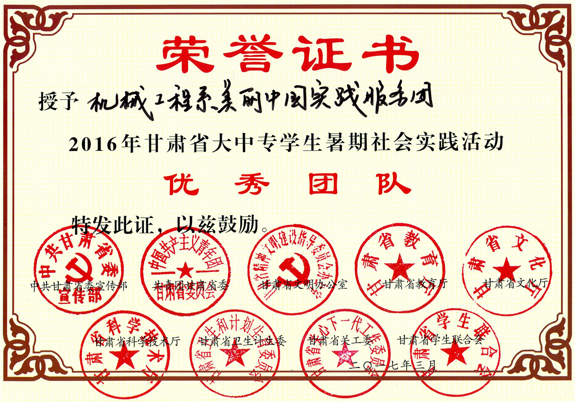 甘肅省大中專學(xué)生暑期社會(huì)實(shí)踐活動(dòng)優(yōu)秀團(tuán)隊(duì)---機(jī)械制造系美麗中國(guó)實(shí)踐服務(wù)團(tuán)