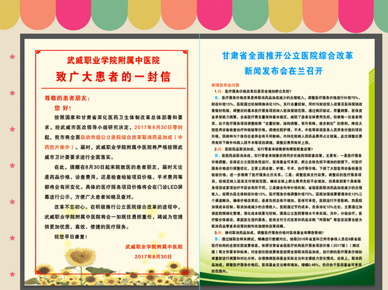 為了搞好公立醫(yī)院綜合改革,醫(yī)院加大對啟動公立醫(yī)院綜合改革工作的宣傳力度,通過醫(yī)院門診大廳LED屏幕、電子顯示屏、宣傳展架、宣傳彩頁及微信公眾號推送等多種方式擴大醫(yī)院綜合改革宣傳,對患者及家屬做好正面引導(dǎo)工作,為醫(yī)院綜合改革任務(wù)的落實營造良好的氛圍。