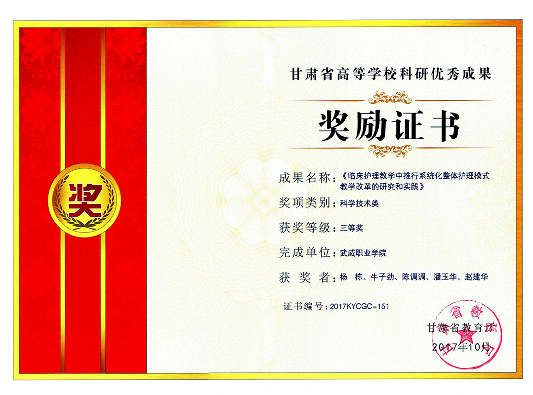 2017年度甘肅省高等學(xué)??蒲袃?yōu)秀成果獎勵證書