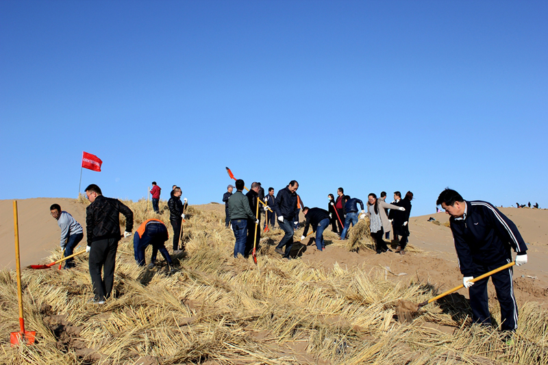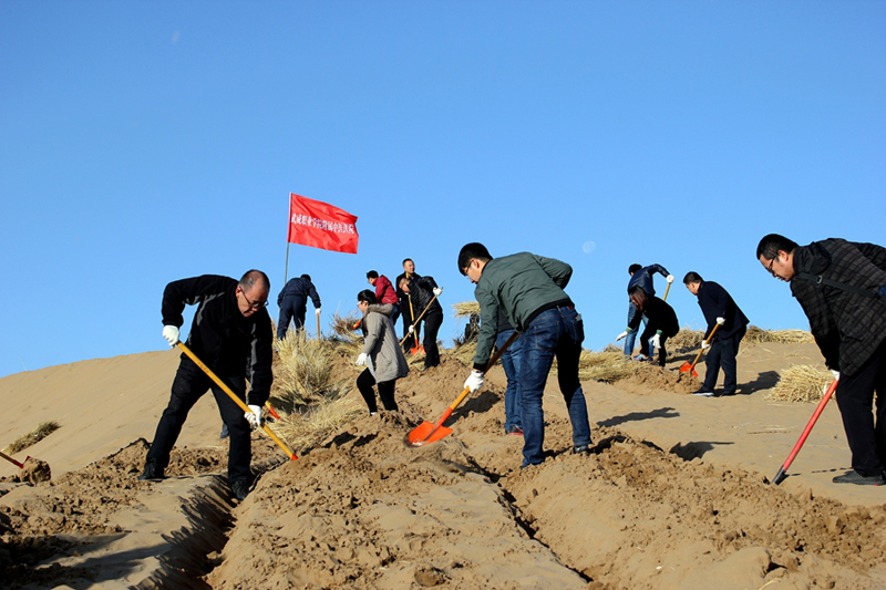 ?11月7日,按照市委市政府統(tǒng)一安排,直屬附屬醫(yī)院干部職工共計(jì)30余人前往涼州區(qū)榮生路南側(cè)八十里大沙頭道槽參加義務(wù)壓沙治沙勞動(dòng)。在黃沙茫茫的大沙漠上,鮮紅色的醫(yī)院院旗迎風(fēng)招展,醫(yī)院干部職工在沙丘上揮鍬開(kāi)溝、鋪稻草、培沙土、草方格逐漸覆蓋了一個(gè)個(gè)沙丘,沙丘上的草方格在陽(yáng)光下金光閃閃……